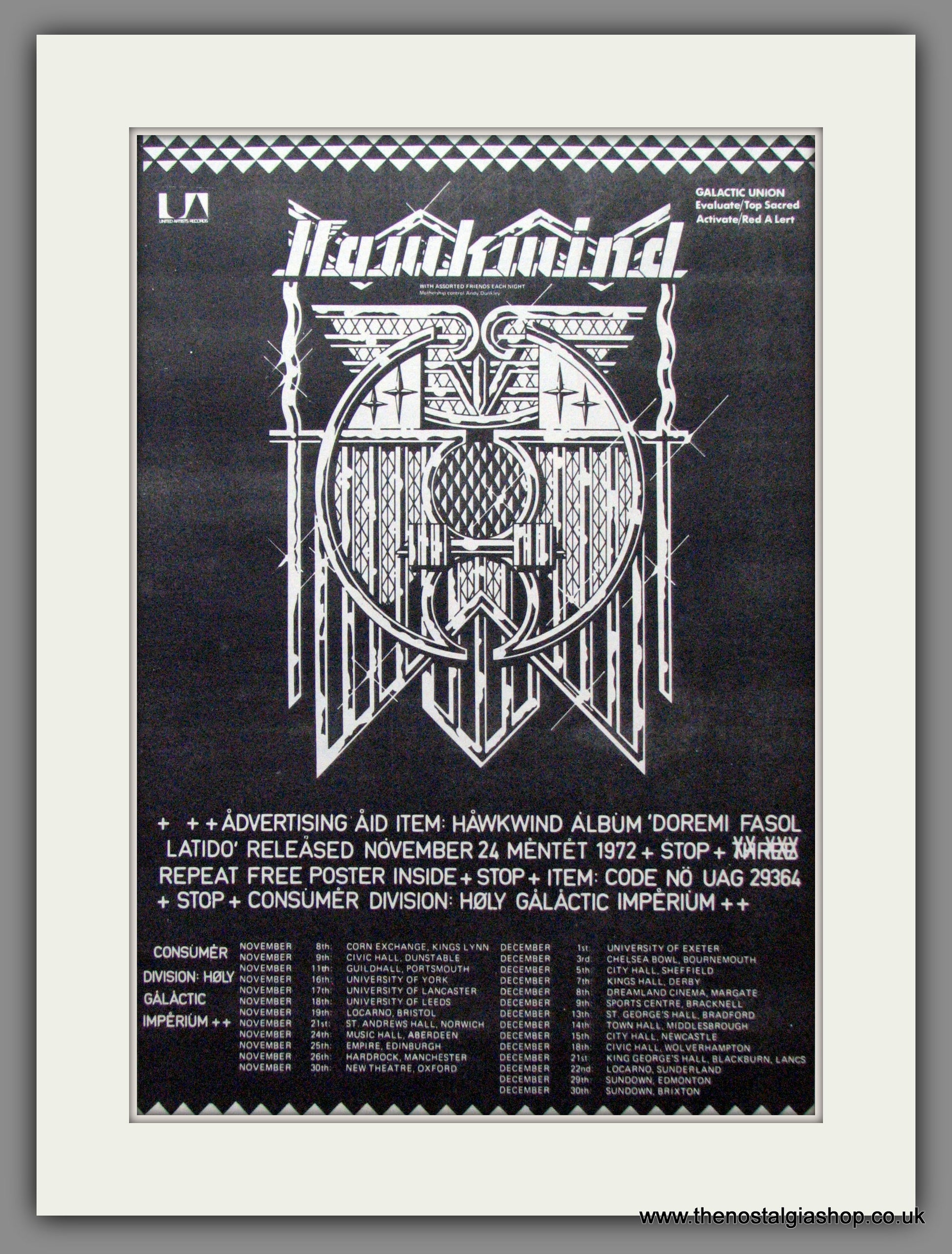 Hawkwind. UK Tour '72. Original Advert 1972 (ref AD12173). Presented and supplied in a cream bevel cut mount with backing card and clear bag. Ready to fit in a 20x16 inch frame. The mounted advert will be posted via courier and well packed - protected with a sheet of hardboard to keep it rigid. Any questions or enquiries, please get in touch, we are here to help! All our adverts, unless clearly stated are originals from the date shown. They make excellent pieces of wall art and stunning gifts. Many are rare and hard to find and once sold, may not be replaced. Remember you are buying a piece of history. Website watermark is not on original.