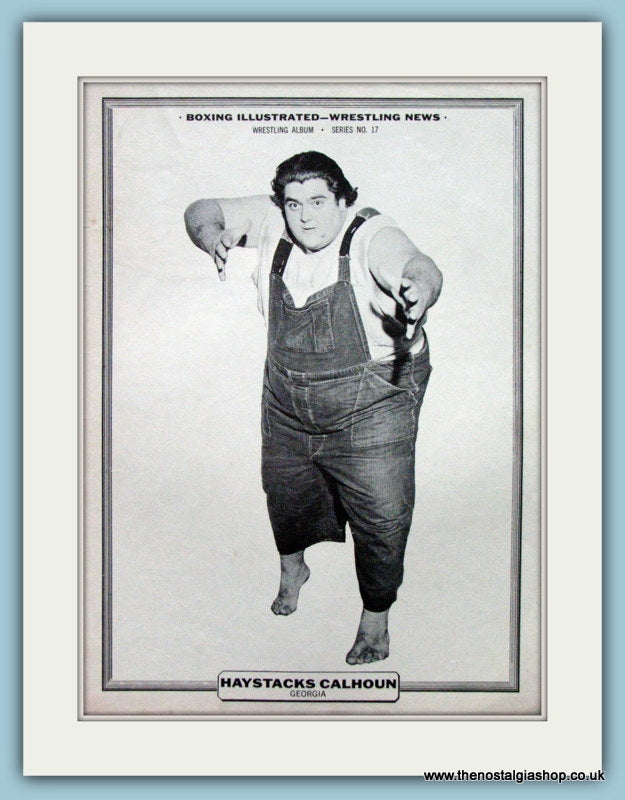 Haystacks Calhoun. (pre Giant Haystacks era!) Vintage Wrestlers.Classic original print 1960. Presented in cream bevel cut mount with backing card and clear bag. Ready to fit in 14 x 11 inch frame. Want it framing? If so, buy this then go to Frames Available Category. Click to buy on the suitable frame and we will do the rest. All our adverts, unless clearly stated are Originals from the date shown They make excellent pieces of wall art and stunning gifts. Many are rare and hard to find and once sold, may not be replaced. Remember you are buying a piece of history. Website watermark is not on original.