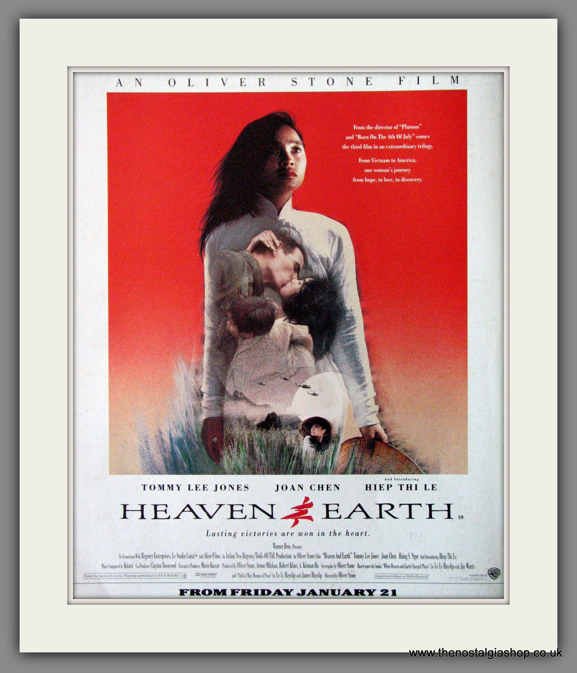 Heaven & Earth, Tommy Lee Jones, Joan Chen. Classic original advert 1994. Presented and Supplied in cream bevel cut mount with backing card and clear bag. Ready to fit in 14 x 11 inch frame. Want it framing? If so, buy this then go to Frames Available Category. Click to buy on the suitable frame and we will do the rest. All our adverts, unless clearly stated are Originals from the date shown. They make excellent pieces of wall art and stunning gifts. Many are rare and hard to find and once sold, may not be replaced. Remember you are buying a piece of history. Website watermark is not on original.