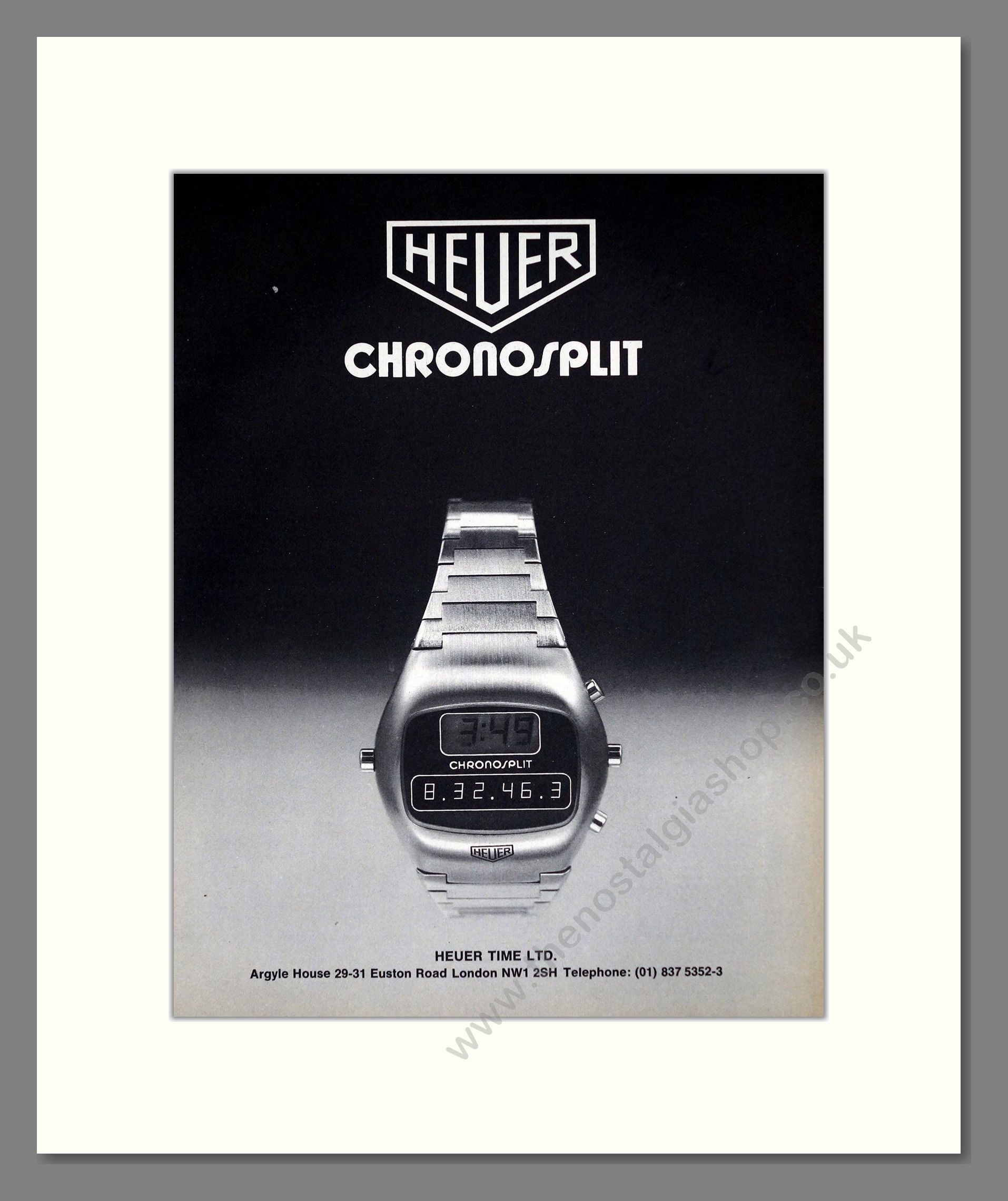 Heuer - Chronosplit. Vintage Advert. This is a classic original advert from 1976. Presented and supplied in a cream bevel cut mount with backing card and clear bag. Ready to fit in a 14 x 11 inches frame. The mounted advert will be posted via courier and well packed - protected with a sheet of hardboard to keep it rigid. Any questions or enquiries, please get in touch, we are here to help! All our adverts, unless clearly stated are originals from the date shown. They make excellent pieces of wall art and stunning gifts. Many are rare and hard to find and once sold, may not be replaced. Remember you are buying a piece of history. Website watermark is not on original.