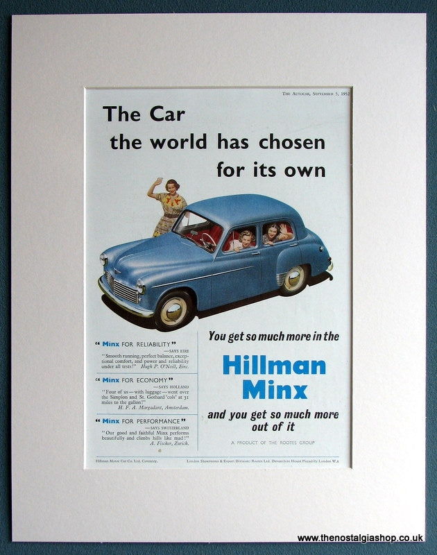 Hillman Minx. The car the world has chosen for its own. Classic original advert 1952. Professionally sealed and presented in cream bevel cut mount with backing card. Ready to fit in 14 x 11 inch frame. Want it framing? If so, buy this then go to Frames Available Catagory. Click to buy on the suitable frame and we will do the rest. All our adverts, unless clearly stated are Originals from the date shown. They make excellent pieces of wall art and stunning gifts. Many are rare and hard to find and once sold, may not be replaced. Remember you are buying a piece of history. Website watermark is not on original.