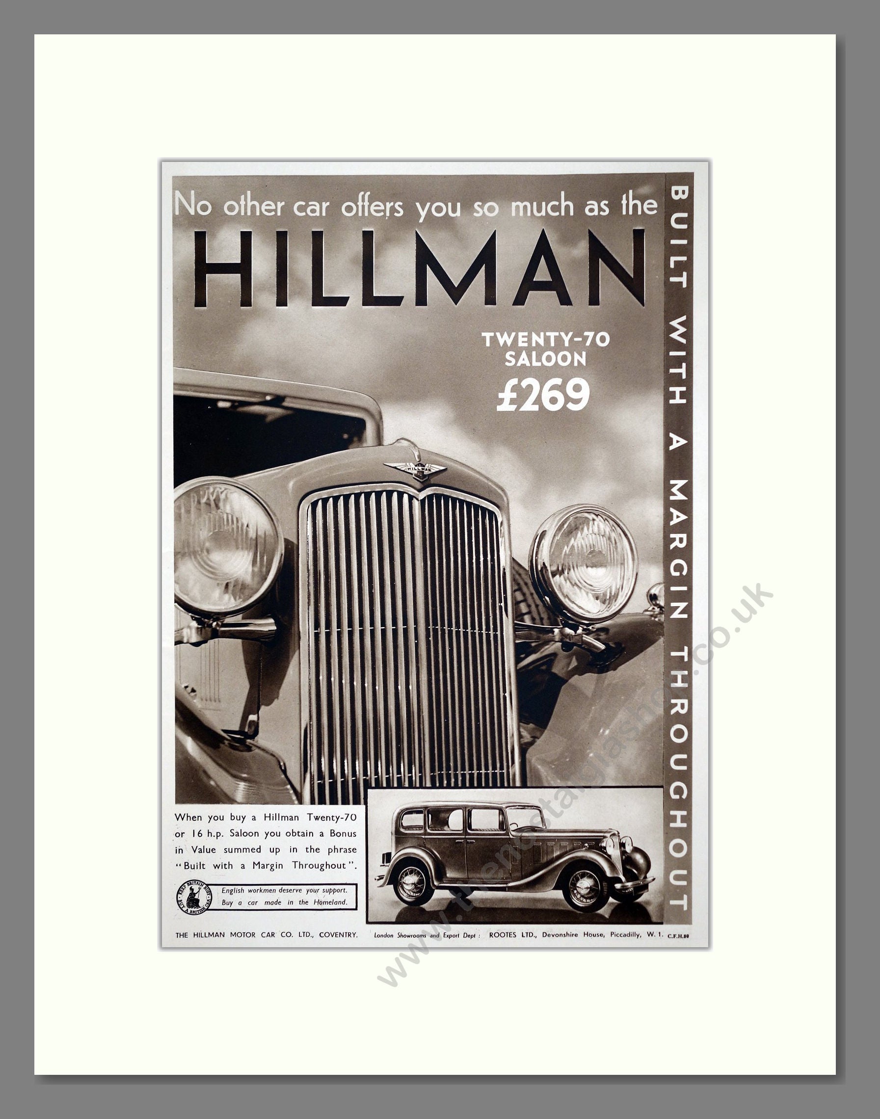 Hillman 20-70 Saloon. Original Vintage Advert 1934. Presented and Supplied in a cream bevel cut mount with backing card and clear bag. Ready to fit in 18 x 14 inch frame. All our adverts, unless clearly stated are Originals from the date shown They make excellent pieces of wall art and stunning gifts. Many are rare and hard to find and once sold, may not be replaced. Remember you are buying a piece of history. Website watermark is not on original.