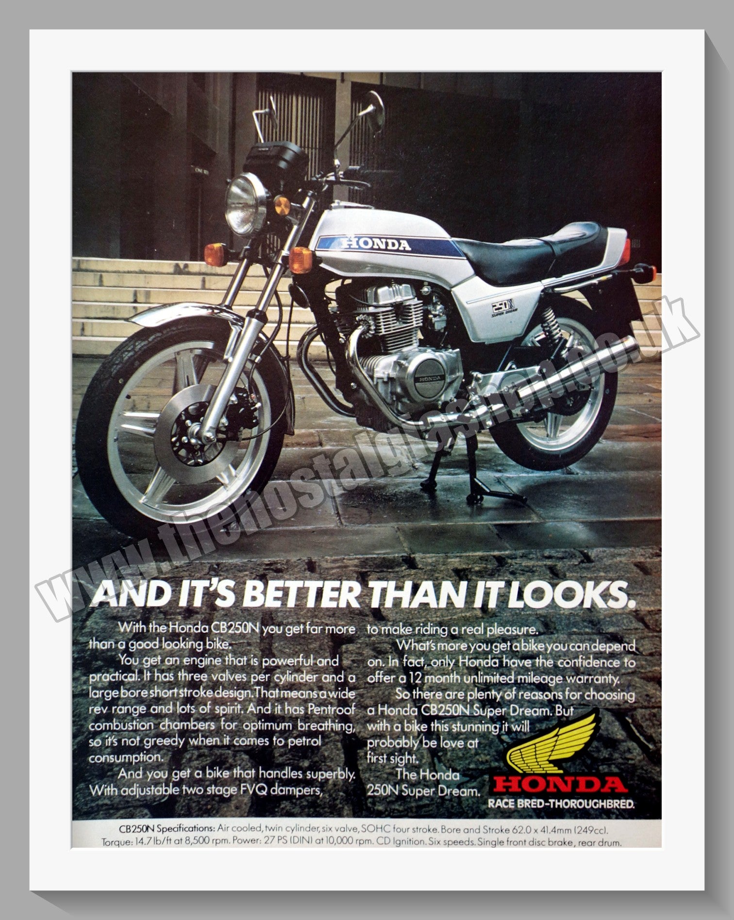 Honda CB250N Motorcycle. Original Vintage Advert 1979. Presented and Supplied in a 14 x 11 Inch, cream bevel cut mount with backing card and clear bag. Ready to frame. All our adverts, unless clearly stated are Originals from the date shown. They make excellent pieces of wall art and stunning gifts. Many are rare and hard to find and once sold, may not be replaced. Remember you are buying a piece of history. Website watermark is not on original. Honda Motorcycles, Honda Bikes, Vintage Honda.