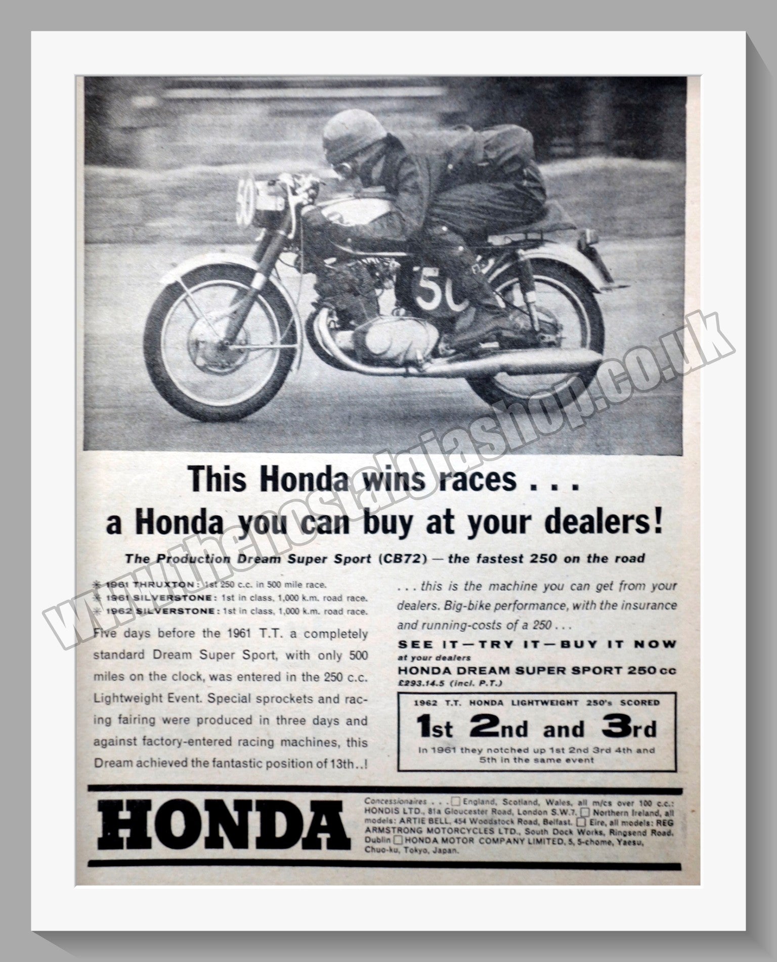 Honda CB72 Motorcycle. Original Vintage Advert 1962. Presented and Supplied in a 14 x 11 Inch, cream bevel cut mount with backing card and clear bag. Ready to frame. All our adverts, unless clearly stated are Originals from the date shown. They make excellent pieces of wall art and stunning gifts. Many are rare and hard to find and once sold, may not be replaced. Remember you are buying a piece of history. Website watermark is not on original. Honda Motorcycles, Honda Bikes, Vintage Honda.