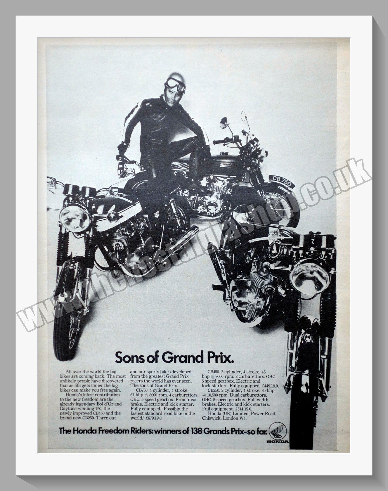 Honda Motorcycles. Original Vintage Advert. 1962. Presented and Supplied in a 14 x 11 Inch, cream bevel cut mount with backing card and clear bag. Ready to frame. All our adverts, unless clearly stated are Originals from the date shown. They make excellent pieces of wall art and stunning gifts. Many are rare and hard to find and once sold, may not be replaced. Remember you are buying a piece of history. Website watermark is not on original. Honda Motorcycles, Honda Bikes, Vintage Honda.