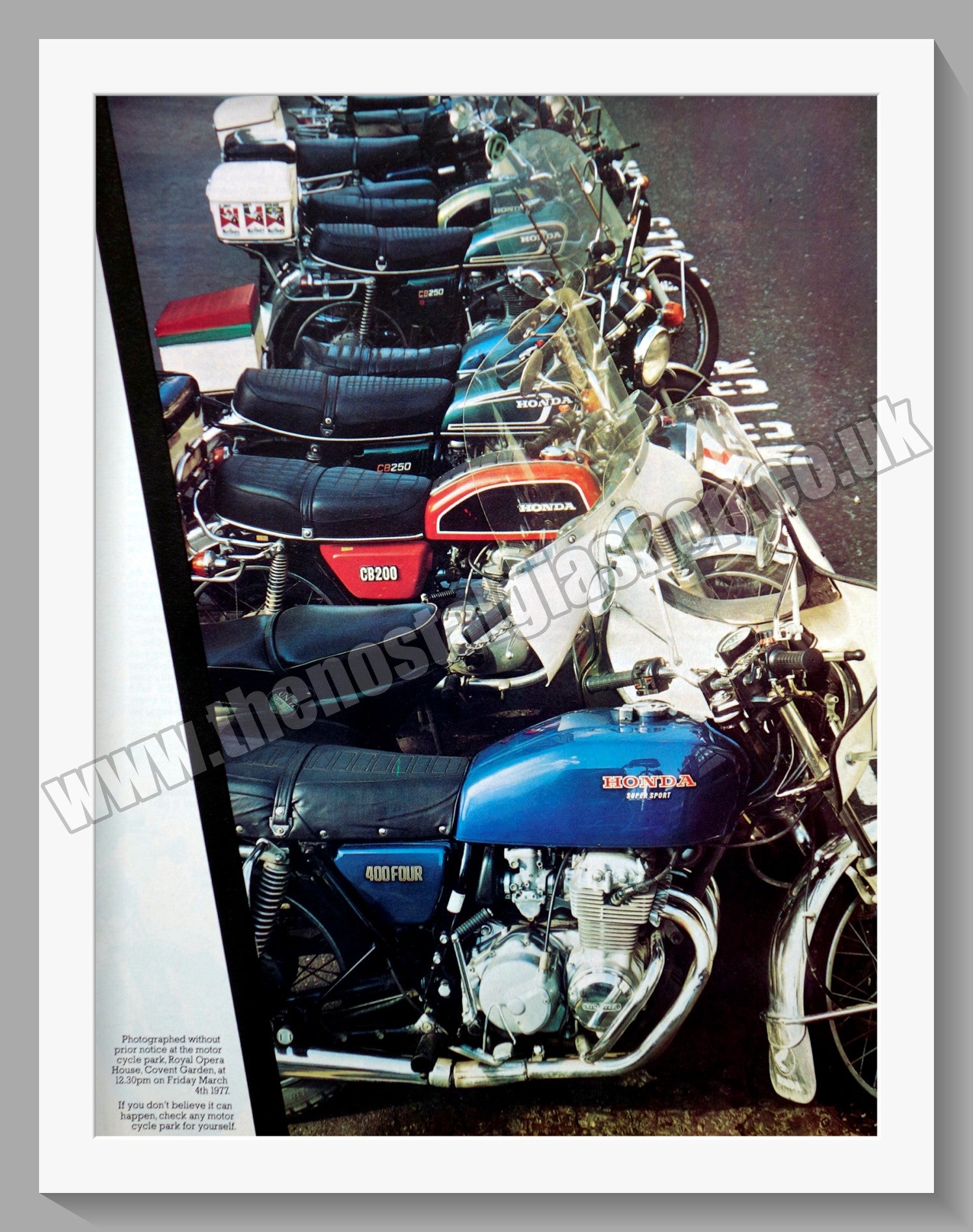 Honda Motorcycles. Original Vintage Double Advert 1977. Presented and Supplied in two 14 x 11 Inch, cream bevel cut mounts with backing cards and clear bags. Ready to frame. All our adverts, unless clearly stated are Originals from the date shown. They make excellent pieces of wall art and stunning gifts. Many are rare and hard to find and once sold, may not be replaced. Remember you are buying a piece of history. Website watermark is not on original. Honda Motorcycles, Honda Bikes, Vintage Honda.