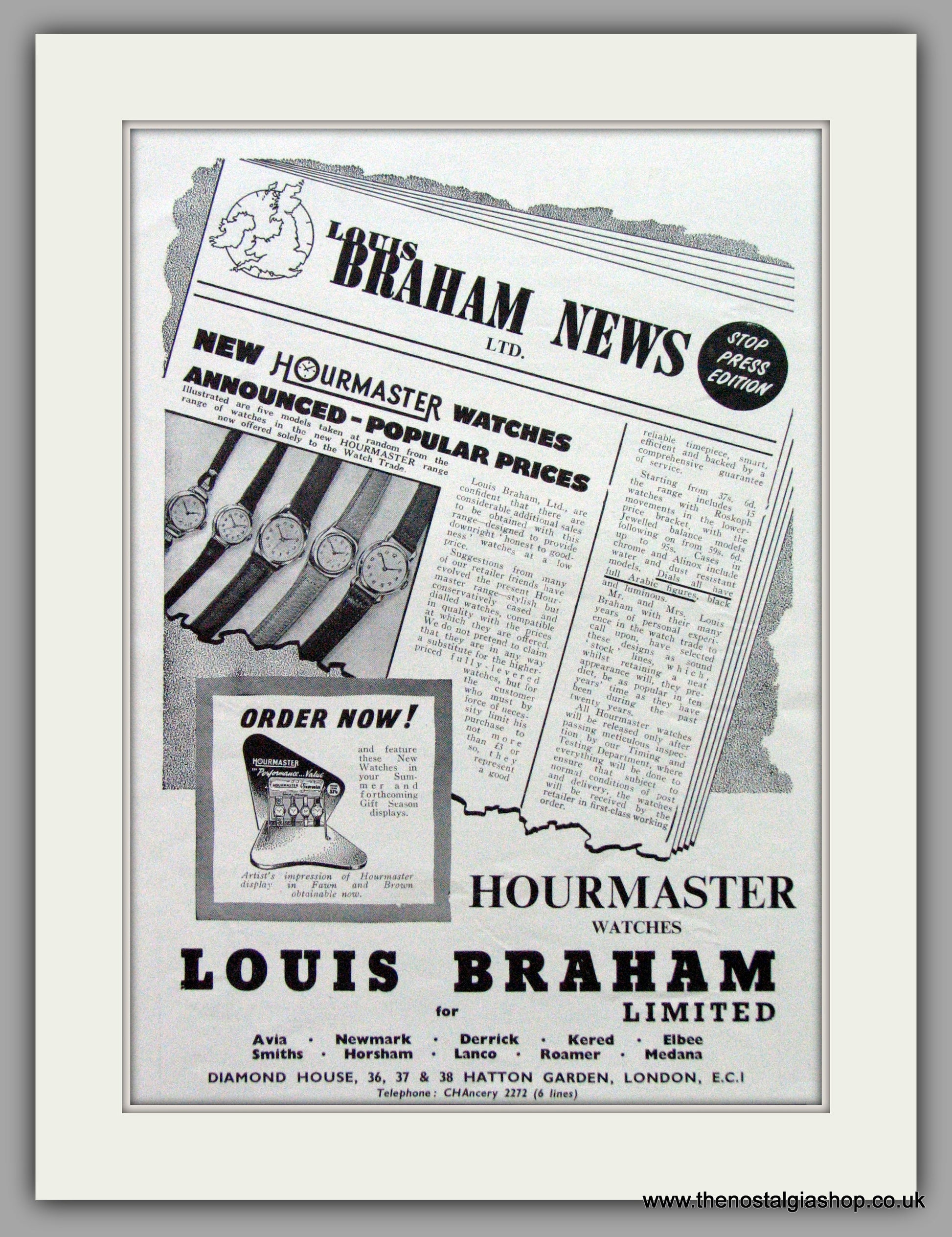 Hourmaster Watches. Louis Braham news. Vintage Advert. Original Advert 1956. Presented in cream bevel cut mount with backing card and clear bag. Ready to fit in 14 x 11 inch frame. Want it framing? If so, buy this then go to Frames Available Category. Click to buy on the suitable frame(s) and we will do the rest. All our adverts, unless clearly stated are Originals from the date shown. They make excellent pieces of wall art and stunning gifts. Many are rare and hard to find and once sold, may not be replaced. Remember you are buying a piece of history. Website watermark is not on original.