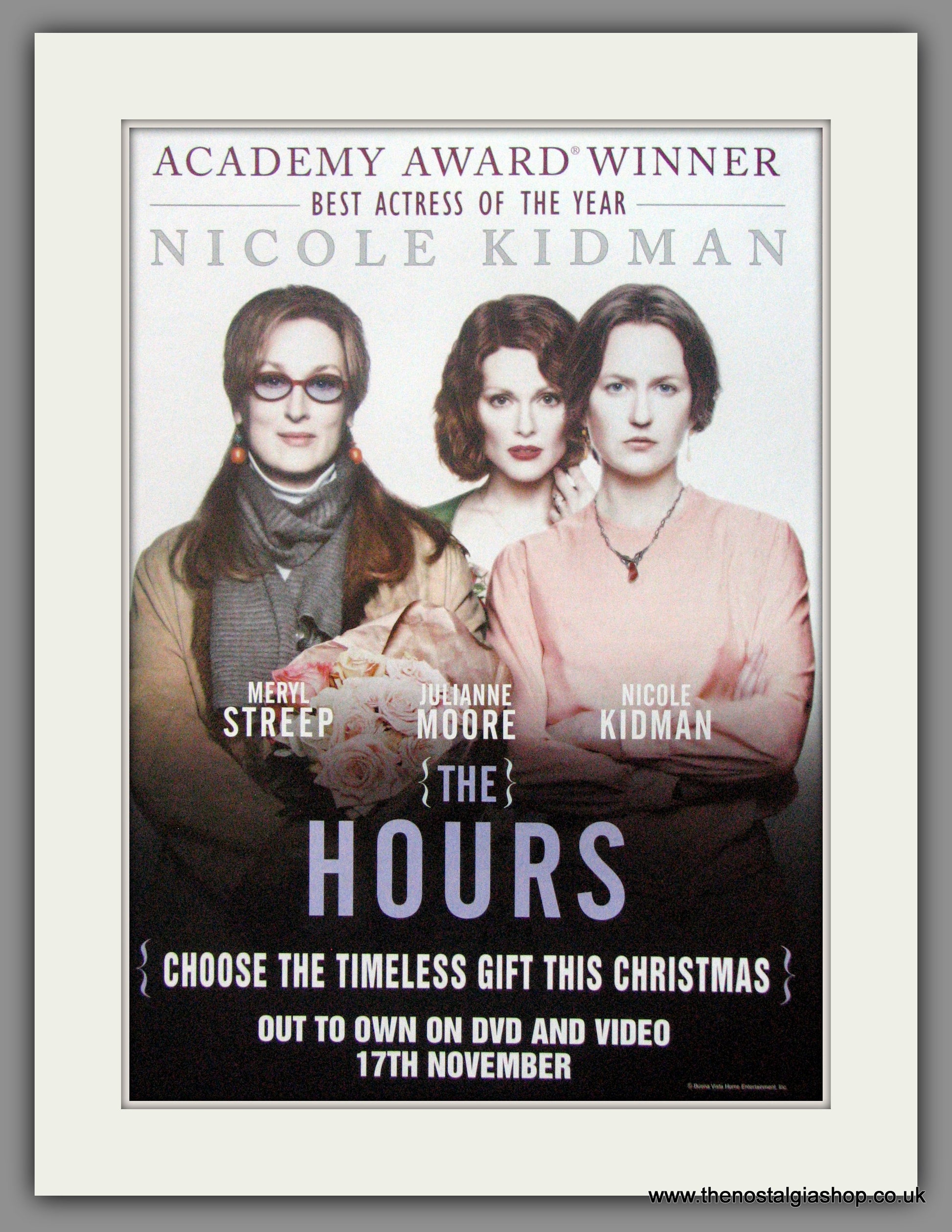 The Hours-Meryl Streep, Julianne Moore, Nicole Kidman. Vintage Advert. Classic original advert 2003. Presented in cream bevel cut mount with backing card and clear bag. Ready to fit in 14 x 11 inch frame. Want it framing? If so, buy this then go to Frames Available Category. Click to buy on the suitable frame and we will do the rest. All our adverts, unless clearly stated are Originals from the date shown. They make excellent pieces of wall art and stunning gifts. Many are rare and hard to find and once sold, may not be replaced. Remember you are buying a piece of history. Website watermark is not on original.