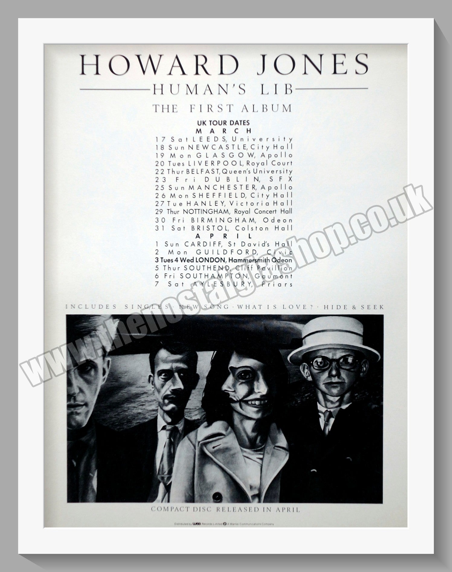 Howard Jones. Human's Lib. Vintage Advert. Original advert 1984. Presented and Supplied in a cream bevel cut mount with backing card and clear bag. Ready to fit in 14 x 11 inch frame. The mounted advert will be posted via courier and well packed - protected with a sheet of hardboard to keep it rigid. Any questions or inquiries, please get in touch, we are here to help! All our adverts, unless clearly stated are Originals from the date shown. They make excellent pieces of wall art and stunning gifts. Many are rare and hard to find and once sold, may not be replaced. Remember you are buying a piece of history. Website watermark is not on original.