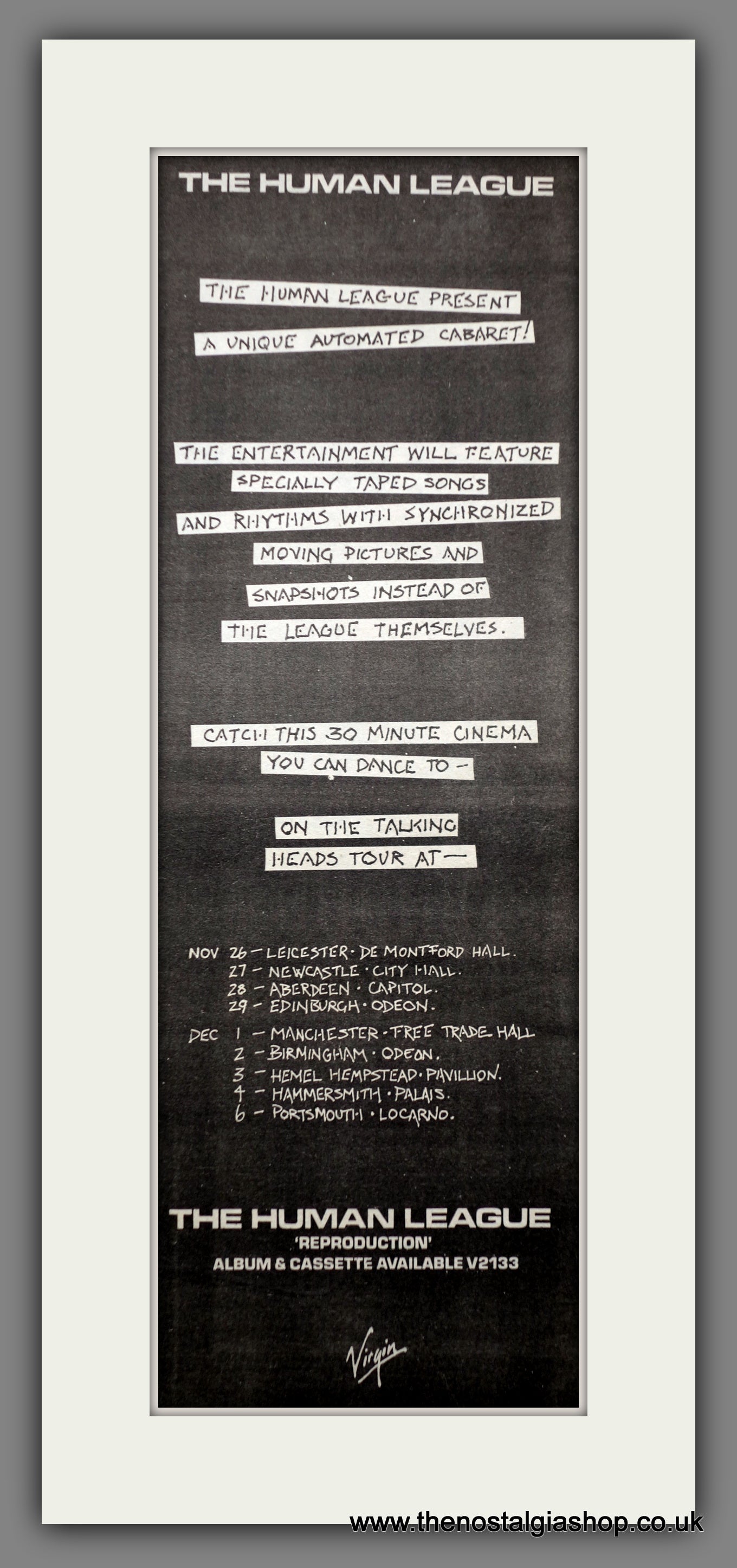 Human League Tour Dates. This is a large Original Vintage Advert 1979. Presented and Supplied in a cream, bevel cut mount with backing card and clear bag. Ready to fit in 20 x 10 inch frame. The mounted advert will be posted via courier and well packed - protected with a sheet of hardboard to keep it rigid. Any questions or inquiries, please get in touch, we are here to help! All our adverts, unless clearly stated are Originals from the date shown. They make excellent pieces of wall art and stunning gifts. Many are rare and hard to find and once sold, may not be replaced. Remember you are buying a piece of history. Website watermark is not on original.