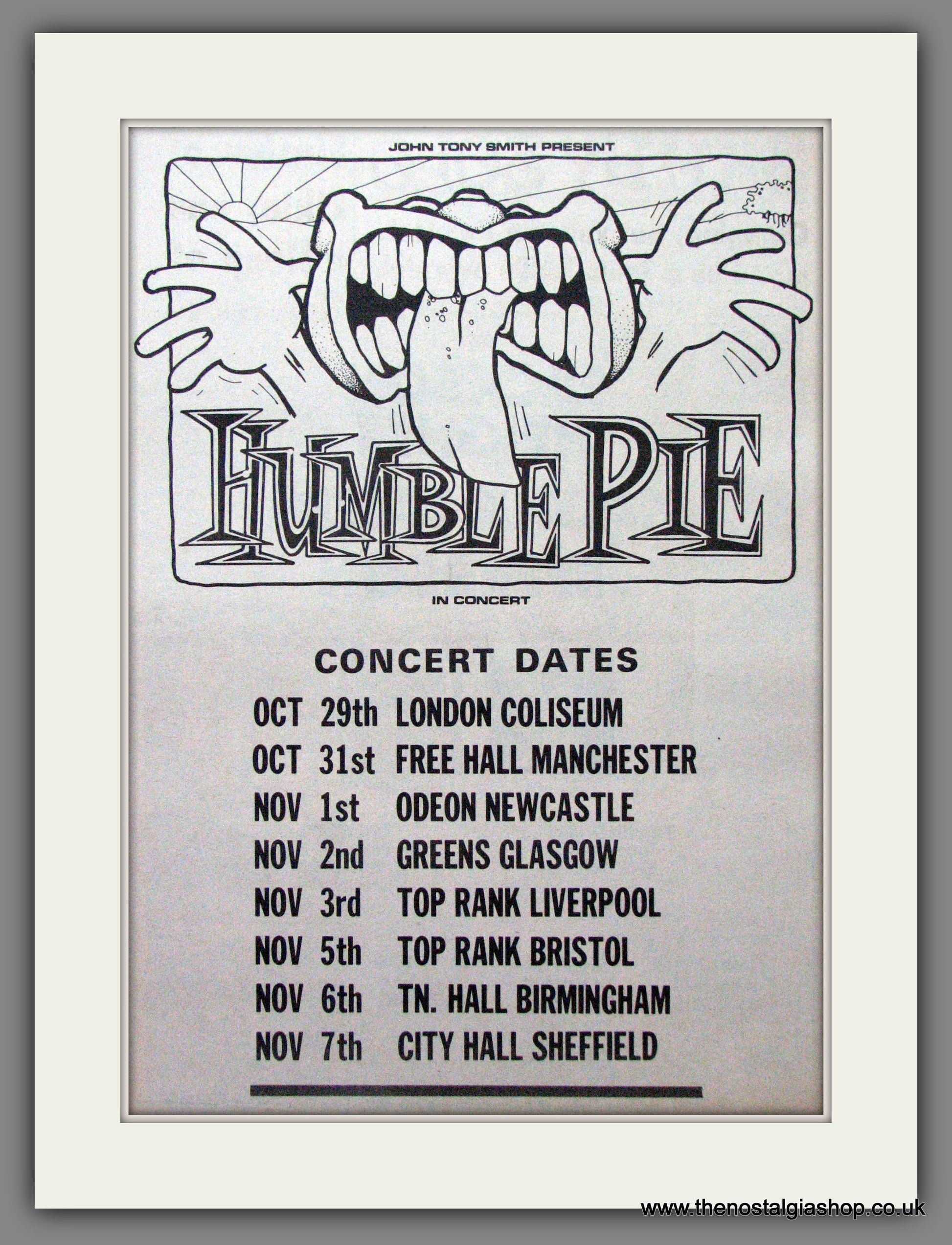 Humble Pie. UK Tour. This is a large classic Original Vintage Advert 1972. Presented and Supplied in a cream, bevel cut mount with backing card and clear bag. Ready to fit in 20 x 16 inch frame. The mounted advert will be posted via courier and well packed - protected with a sheet of hardboard to keep it rigid. Any questions or inquiries, please get in touch, we are here to help! All our adverts, unless clearly stated are Originals from the date shown. They make excellent pieces of wall art and stunning gifts. Many are rare and hard to find and once sold, may not be replaced. Remember you are buying a piece of history. Website watermark is not on original.