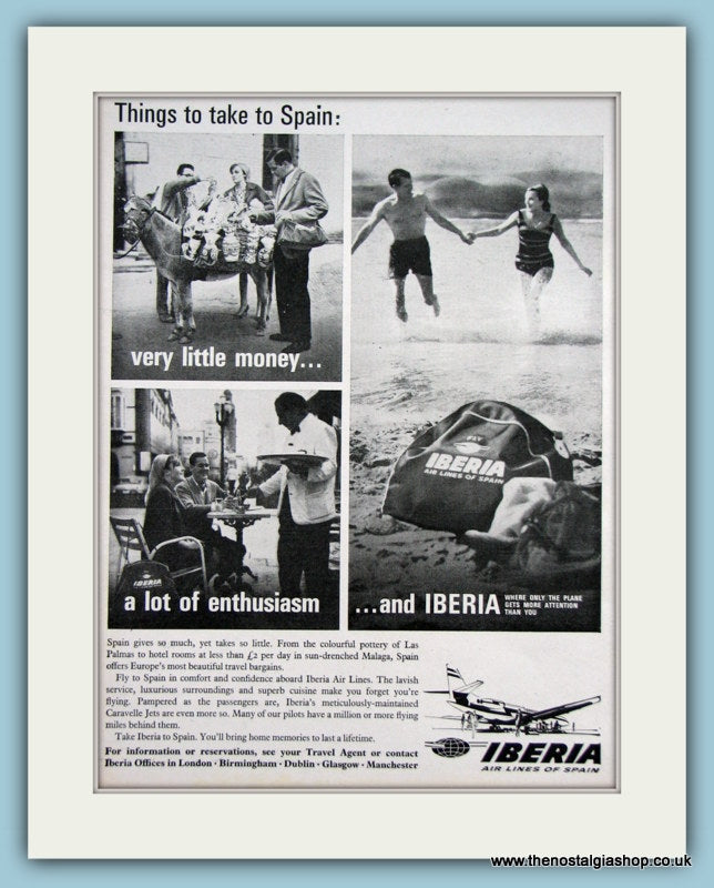 Iberia Airline. Things to take to Spain very little money, alot of enthusiasm, and Iberia . Classic original advert 1964. Professionally sealed and presented in cream bevel cut mount with backing card. Ready to fit in 14 x 11 inch frame. Want it framing? If so, buy this then go to Frames Available Catagory. Click to buy on the suitable frame and we will do the rest. All our adverts, unless clearly stated are Originals from the date shown. They make excellent pieces of wall art and stunning gifts. Many are rare and hard to find and once sold, may not be replaced. Remember you are buying a piece of history. Website watermark is not on original.