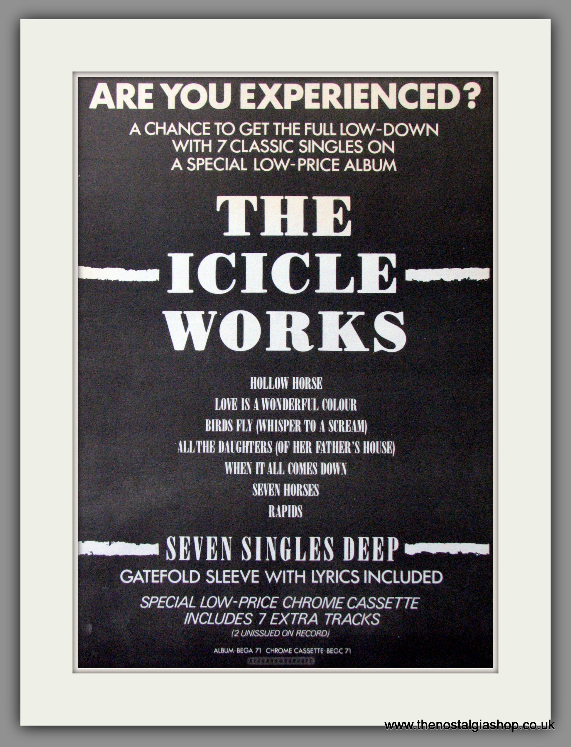 Icicle Works. Seven Singles Deep. Original Advert 1986 (ref AD12151). Presented and supplied in a cream bevel cut mount with backing card and clear bag. Ready to fit in a 20x16 inch frame. The mounted advert will be posted via courier and well packed - protected with a sheet of hardboard to keep it rigid. Any questions or enquiries, please get in touch, we are here to help! All our adverts, unless clearly stated are originals from the date shown. They make excellent pieces of wall art and stunning gifts. Many are rare and hard to find and once sold, may not be replaced. Remember you are buying a piece of history. Website watermark is not on original.