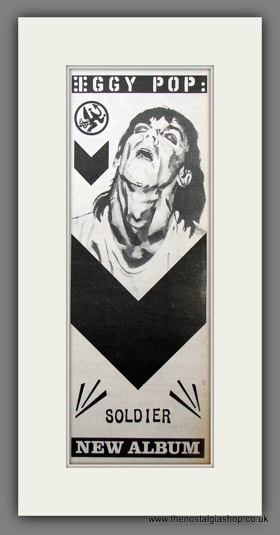 Iggy Pop. Soldier. This is a classic Original Vintage Advert 1980. Presented and Supplied in a cream, bevel cut mount with backing card and clear bag. Ready to fit in 20 x 10 inch frame. The mounted advert will be posted via courier and well packed - protected with a sheet of hardboard to keep it rigid. Any questions or inquiries, please get in touch, we are here to help! All our adverts, unless clearly stated are Originals from the date shown. They make excellent pieces of wall art and stunning gifts. Many are rare and hard to find and once sold, may not be replaced. Remember you are buying a piece of history. Website watermark is not on original.