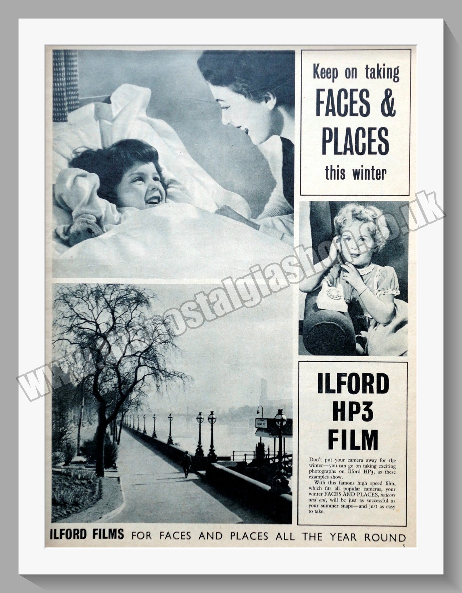Ilford HP3 Film. Vintage Advert. Classic Original Advert 1955. Presented and Supplied in a cream bevel cut mount with backing card and clear bag. Ready to fit in 18 x 14 inch frame. Will be well packed with a sheet of hardboard to keep the mounted Advert flat. All our adverts, unless clearly stated are Originals from the date shown. They make excellent pieces of wall art and stunning gifts. Many are rare and hard to find and once sold, may not be replaced. Remember you are buying a piece of history. Website watermark is not on original. Vintage Cameras, Old Cameras.