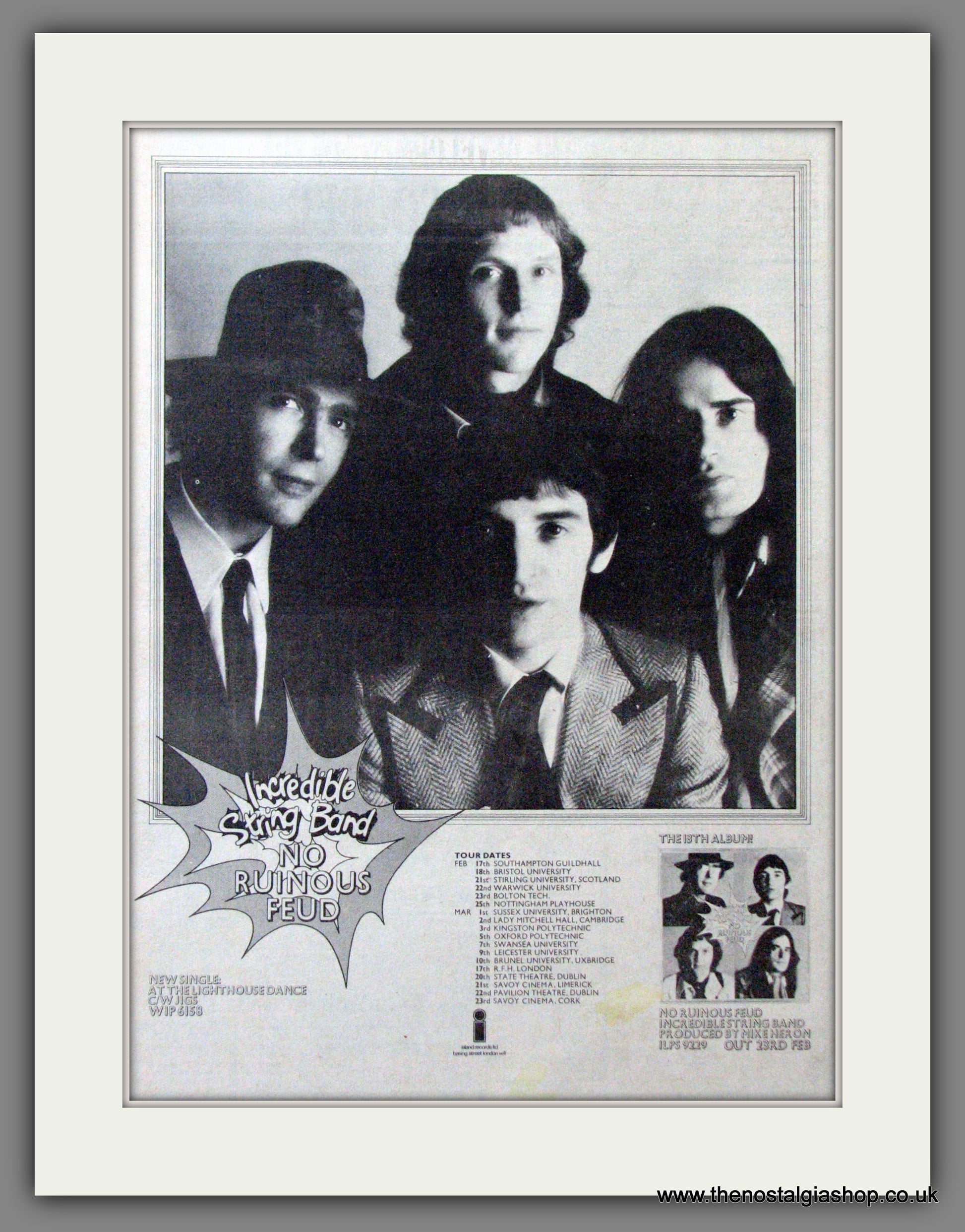 Incredible String Band, No Ruinous Feud. This is a large classic Original Vintage Advert 1973. Presented and Supplied in a cream, bevel cut mount with backing card and clear bag. Ready to fit in 20 x 16 inch frame. The mounted advert will be posted via courier and well packed - protected with a sheet of hardboard to keep it rigid. Any questions or inquiries, please get in touch, we are here to help! All our adverts, unless clearly stated are Originals from the date shown. They make excellent pieces of wall art and stunning gifts. Many are rare and hard to find and once sold, may not be replaced. Remember you are buying a piece of history. Website watermark is not on original.