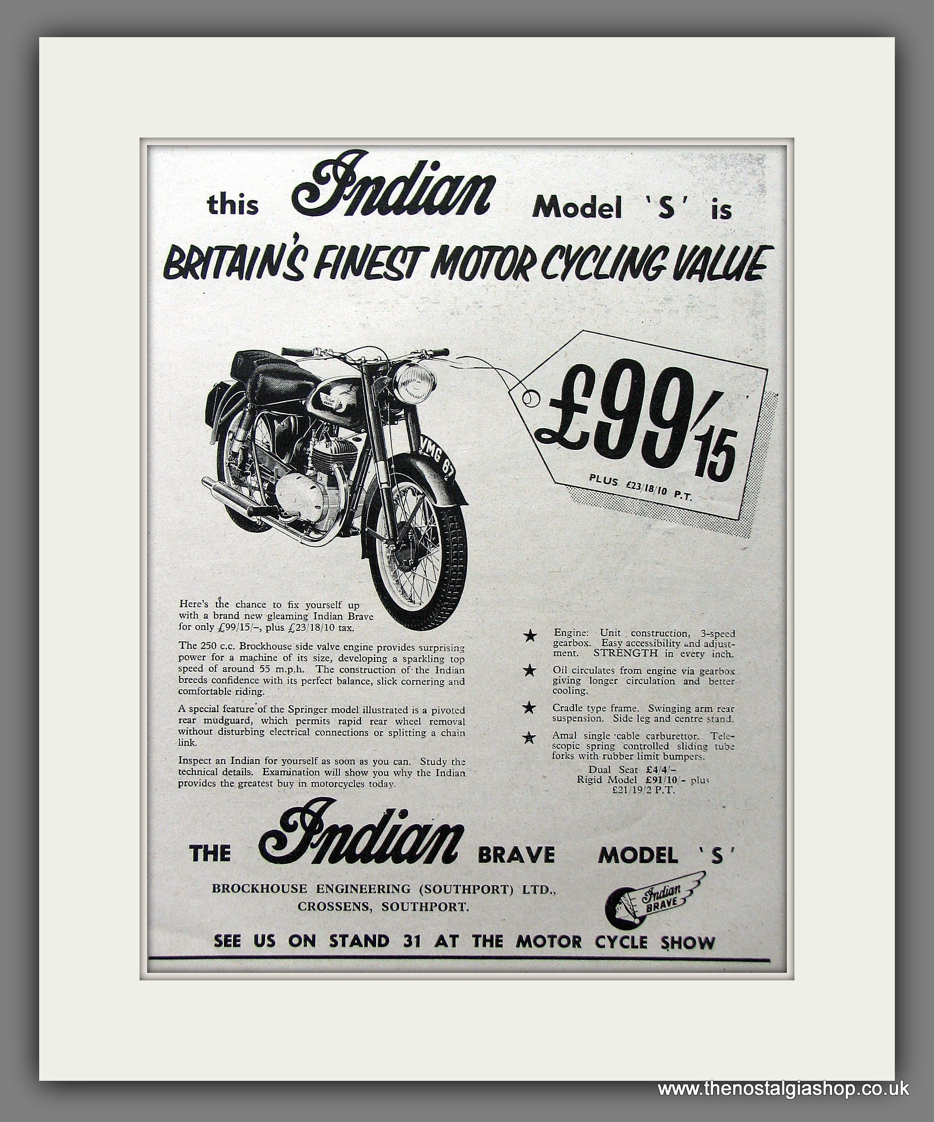 Indian Model S. Setting a new standard in the 250 class. Original advert from 1955. Presented and Supplied in a cream bevel cut mount with backing board. Made to fit straight into 14 x 11 inch frame. The perfect gift. These adverts are all taken from Original publications of the dates stated. They are NOT modern reprints. Many are difficult to get hold of , some are very rare and once sold may not be replaced, Remember, you are buying a piece of historic nostalgia. Lots more adverts available. Please contact us if you don't see the advert you want.