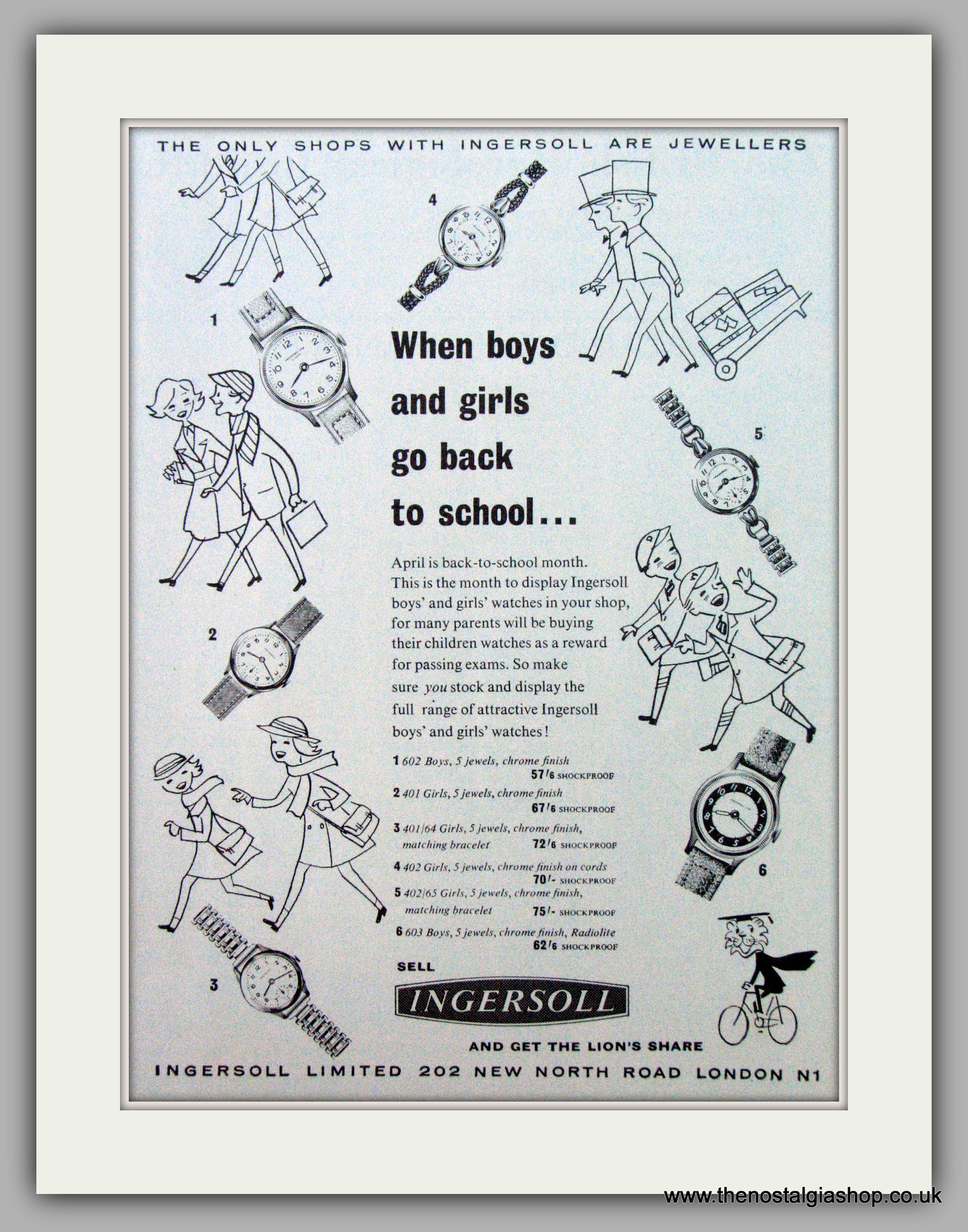 Ingersoll Watches. When Boys and Girls go back to school. Vintage Advert. Original Advert 1959. Presented in cream bevel cut mount with backing card and clear bag. Ready to fit in 14 x 11 inch frame. Want it framing? If so, buy this then go to Frames Available Category. Click to buy on the suitable frame(s) and we will do the rest. All our adverts, unless clearly stated are Originals from the date shown. They make excellent pieces of wall art and stunning gifts. Many are rare and hard to find and once sold, may not be replaced. Remember you are buying a piece of history. Website watermark is not on original.
