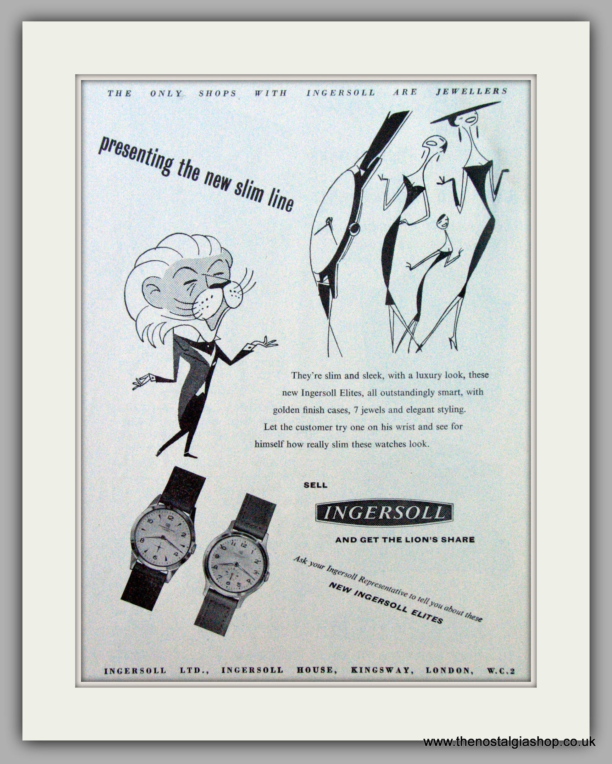 Ingersoll Ladies Watches. Presenting the slim line . Vintage Advert. Original Advert 1957. Presented in cream bevel cut mount with backing card and clear bag. Ready to fit in 14 x 11 inch frame. Want it framing? If so, buy this then go to Frames Available Category. Click to buy on the suitable frame(s) and we will do the rest. All our adverts, unless clearly stated are Originals from the date shown. They make excellent pieces of wall art and stunning gifts. Many are rare and hard to find and once sold, may not be replaced. Remember you are buying a piece of history. Website watermark is not on original.