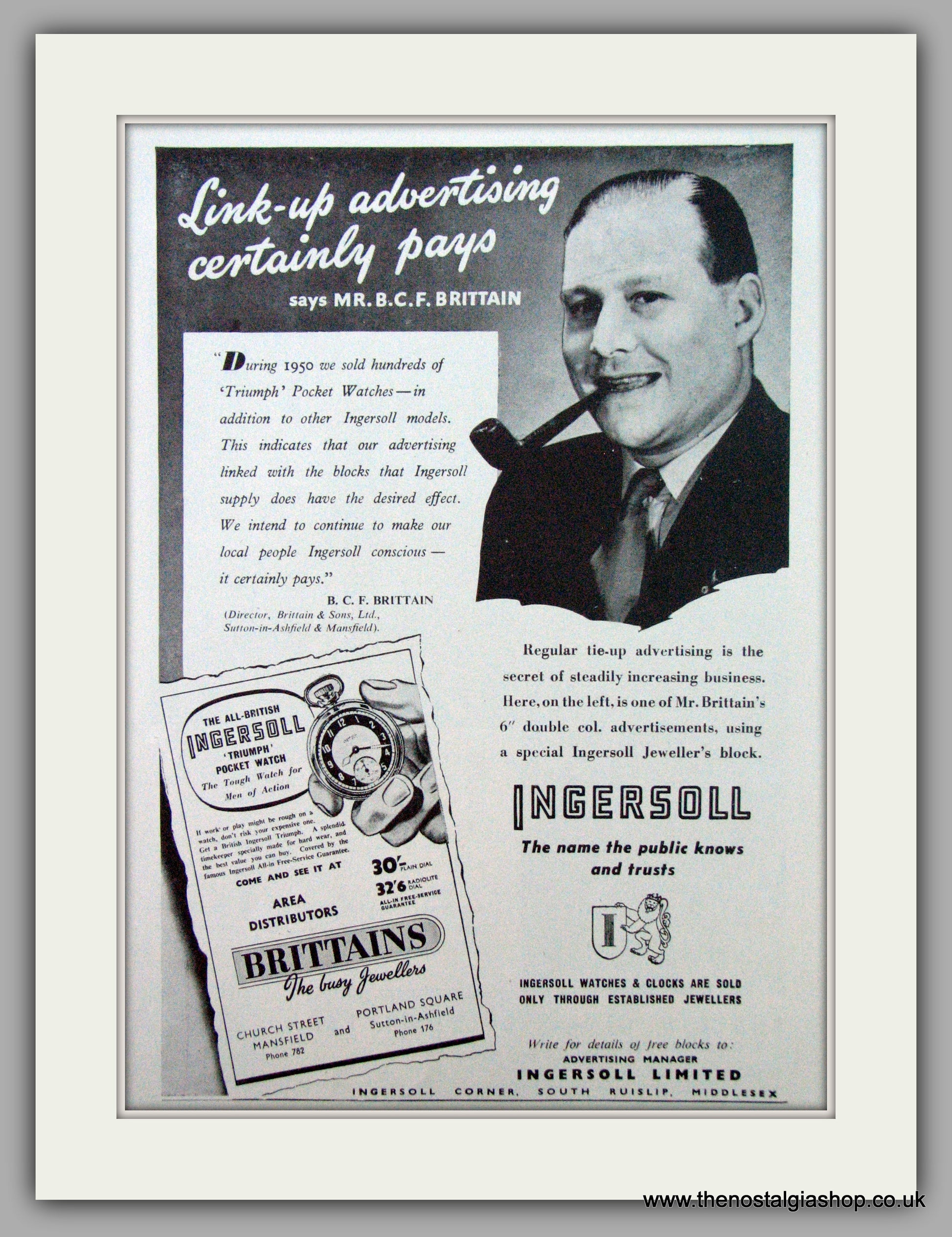 Ingersoll Watches. Link-up advertising certainly pays. Vintage Advert. Original Advert 1951. Presented in cream bevel cut mount with backing card and clear bag. Ready to fit in 14 x 11 inch frame. Want it framing? If so, buy this then go to Frames Available Category. Click to buy on the suitable frame(s) and we will do the rest. All our adverts, unless clearly stated are Originals from the date shown. They make excellent pieces of wall art and stunning gifts. Many are rare and hard to find and once sold, may not be replaced. Remember you are buying a piece of history. Website watermark is not on original.