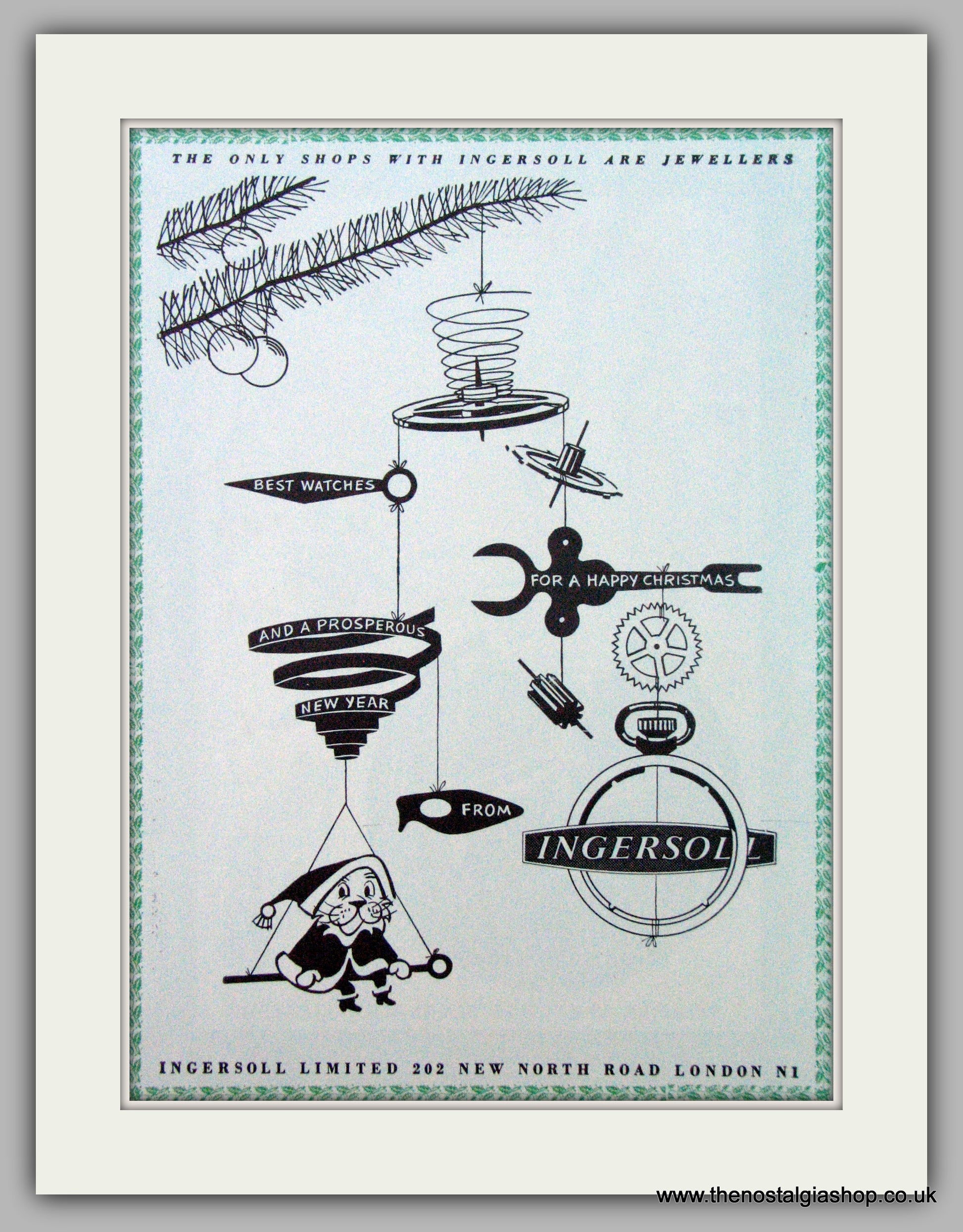 Ingersoll Watches. For a Happy Christmas. Vintage Advert. Original Advert 1958. Presented in cream bevel cut mount with backing card and clear bag. Ready to fit in 14 x 11 inch frame. Want it framing? If so, buy this then go to Frames Available Category. Click to buy on the suitable frame(s) and we will do the rest. All our adverts, unless clearly stated are Originals from the date shown. They make excellent pieces of wall art and stunning gifts. Many are rare and hard to find and once sold, may not be replaced. Remember you are buying a piece of history. Website watermark is not on original.
