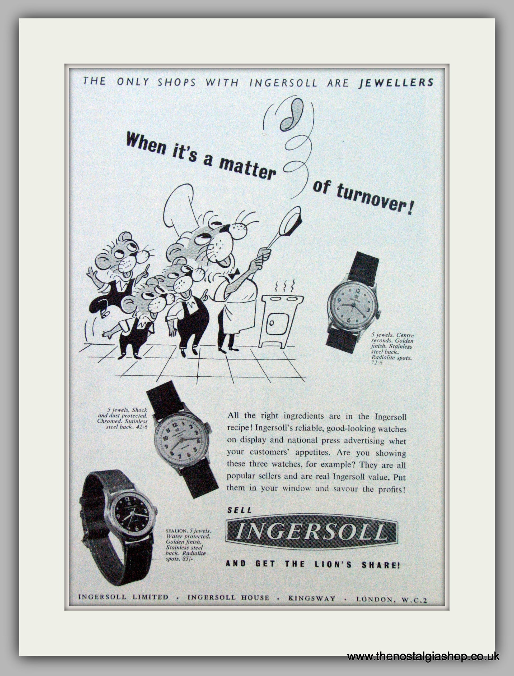 Ingersoll Watches. When its a matter of turnover, featuring the Sealion. Vintage Advert. Original Advert 1955. Presented in cream bevel cut mount with backing card and clear bag. Ready to fit in 14 x 11 inch frame. Want it framing? If so, buy this then go to Frames Available Category. Click to buy on the suitable frame(s) and we will do the rest. All our adverts, unless clearly stated are Originals from the date shown. They make excellent pieces of wall art and stunning gifts. Many are rare and hard to find and once sold, may not be replaced. Remember you are buying a piece of history. Website watermark is not on original.
