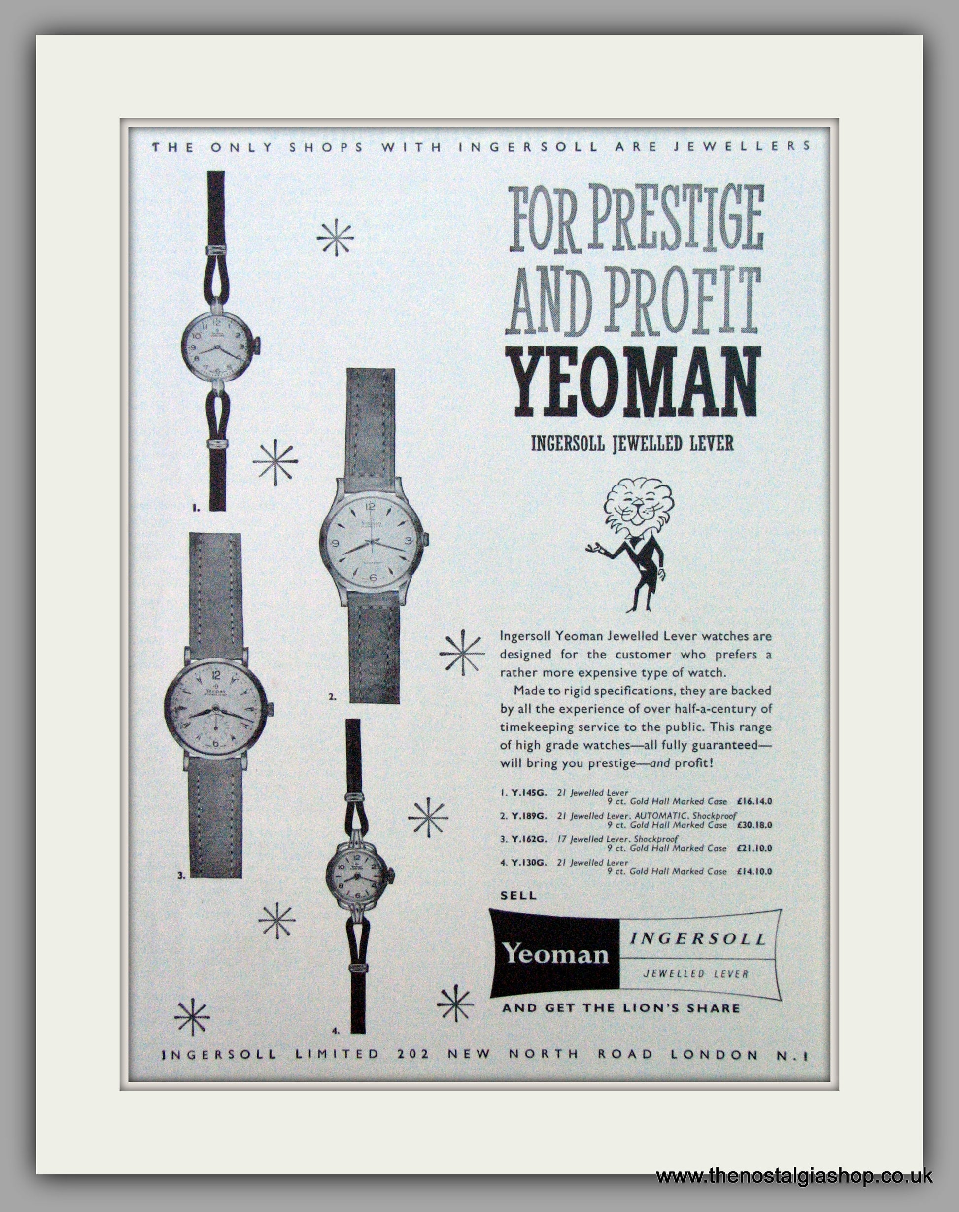 Ingersoll Watches. For prestige and profit Yeoman. Vintage Advert. Original Advert 1961. Presented in cream bevel cut mount with backing card and clear bag. Ready to fit in 14 x 11 inch frame. Want it framing? If so, buy this then go to Frames Available Category. Click to buy on the suitable frame(s) and we will do the rest. All our adverts, unless clearly stated are Originals from the date shown. They make excellent pieces of wall art and stunning gifts. Many are rare and hard to find and once sold, may not be replaced. Remember you are buying a piece of history. Website watermark is not on original.