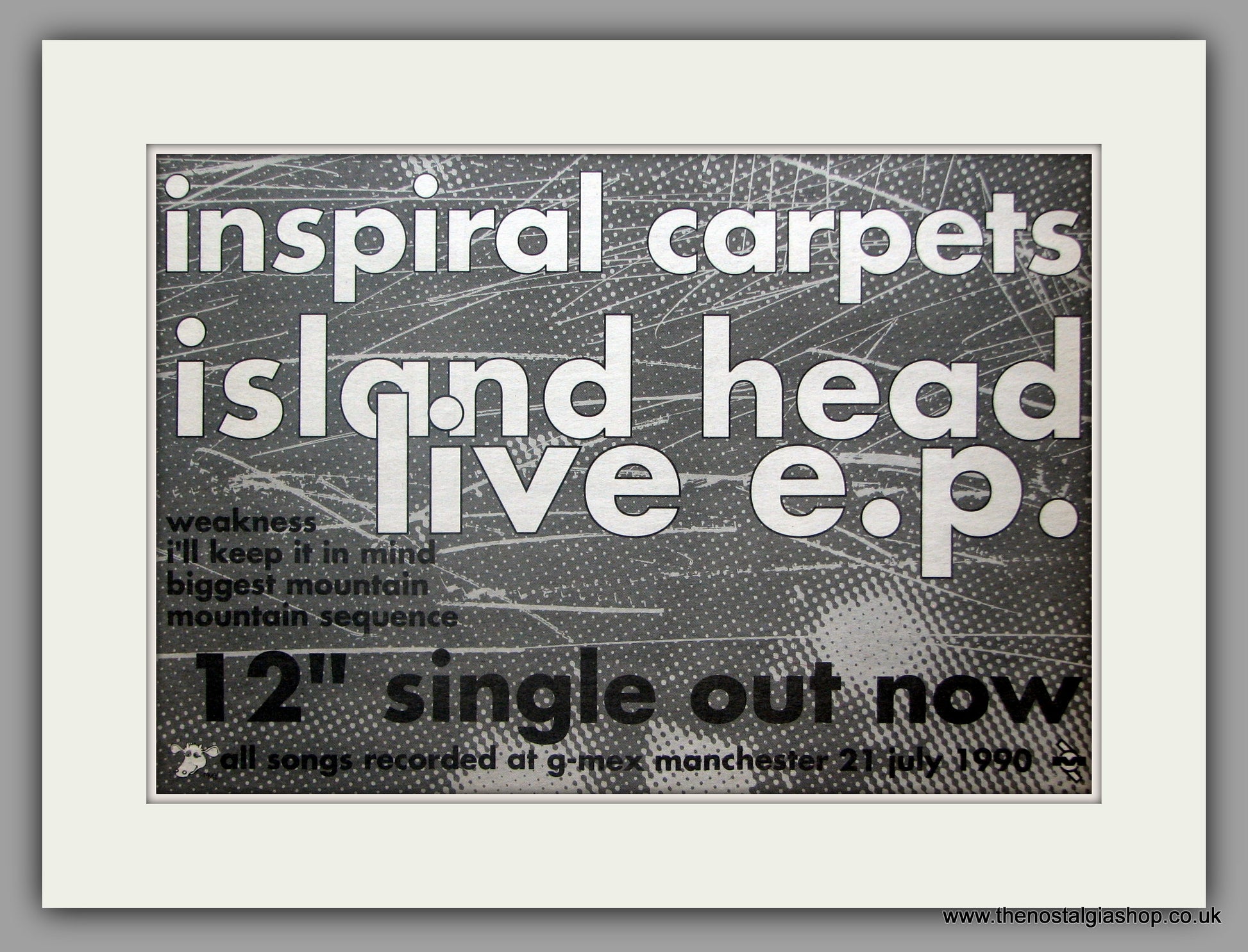 Inspiral Carpets. Island Head Live ep. Classic Original advert 1990. Presented in cream bevel cut mount with backing card and clear bag. Ready to fit in 14 x 11 inch frame. Want it framing? If so, buy this then go to Frames Available Category. Click to buy on the suitable frame and we will do the rest. All our adverts, unless clearly stated are Originals from the date shown. They make excellent pieces of wall art and stunning gifts. Many are rare and hard to find and once sold, may not be replaced. Remember you are buying a piece of history. Website watermark is not on original. House Music, Acid, Trance.