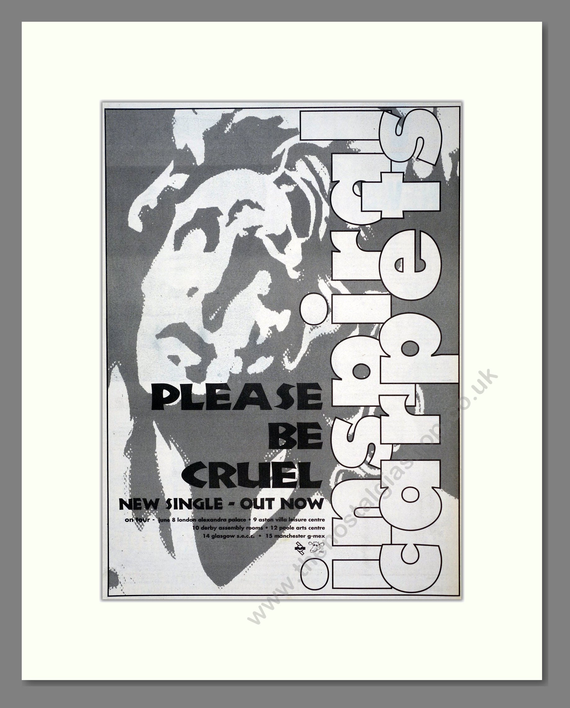 Inspiral Carpets - Please Be Cruel. Vintage Advert. This is a large classic original advert from 1991. Presented and supplied in a cream bevel cut mount with backing card and clear bag. Ready to fit in a 20 x 16 inches frame. The mounted advert will be posted via courier and well packed - protected with a sheet of hardboard to keep it rigid. Any questions or enquiries, please get in touch, we are here to help! All our adverts, unless clearly stated are originals from the date shown. They make excellent pieces of wall art and stunning gifts. Many are rare and hard to find and once sold, may not be replaced. Remember you are buying a piece of history. Website watermark is not on original.