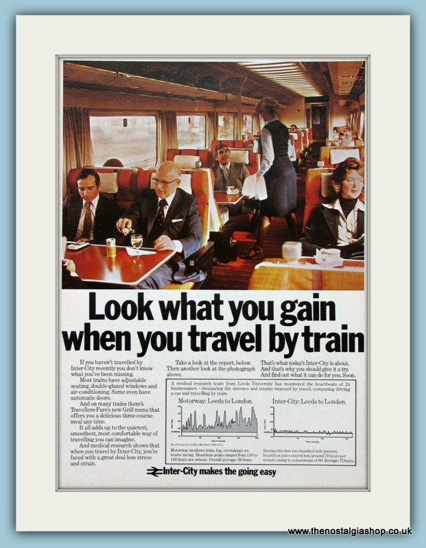 Inter-City. Look what you gain when you travel by train.Classic original advert 1977. Professionally sealed and presented in cream bevel cut mount with backing card. Ready to fit in 14 x 11 inch frame. Want it framing? If so, buy this then go to Frames Available Catagory. Click to buy on the suitable frame and we will do the rest. All our adverts, unless clearly stated are Originals from the date shown. They make excellent pieces of wall art and stunning gifts. Many are rare and hard to find and once sold, may not be replaced. Remember you are buying a piece of history. Website watermark is not on original.