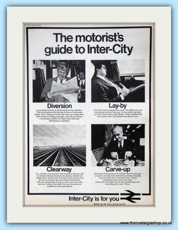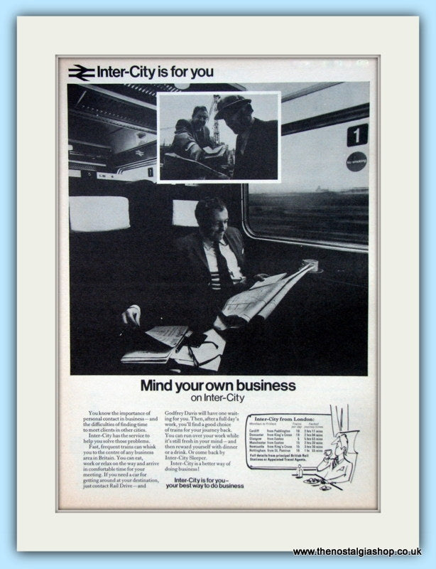 Inter-City . Mind your own business.Classic original adverts 1972 & 1973 (price is for both adverts). Presented in cream bevel cut mount with backing card and clear bag. Each is ready to fit in 14 x 11 inch frames. Want them framing? If so, buy this then go to Frames Available Category. Click to buy on the suitable frame and we will do the rest. All our adverts, unless clearly stated are Originals from the date shown They make excellent pieces of wall art and stunning gifts. Many are rare and hard to find and once sold, may not be replaced. Remember you are buying a piece of history. Website watermark is not on original.