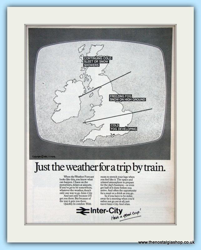Inter-City . Just the weather for a trip by train.Classic original adverts 1976 & 1979 (price is for both adverts). Presented in cream bevel cut mount with backing card and clear bag. Each is ready to fit in 14 x 11 inch frames. Want them framing? If so, buy this then go to Frames Available Category. Click to buy on the suitable frame and we will do the rest. All our adverts, unless clearly stated are Originals from the date shown They make excellent pieces of wall art and stunning gifts. Many are rare and hard to find and once sold, may not be replaced. Remember you are buying a piece of history. Website watermark is not on original.