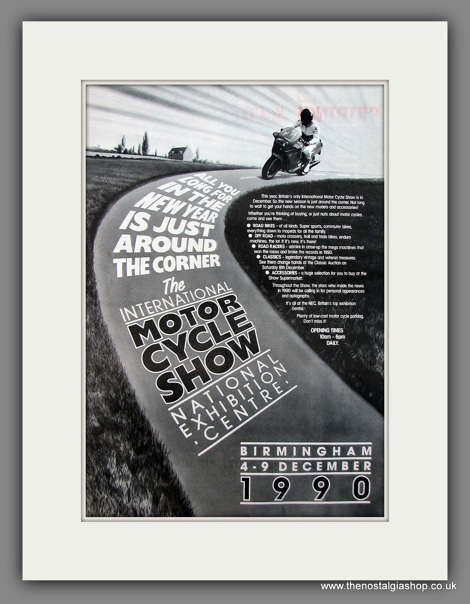 International Motorcycle Show '90. NEC. Original Advert 1990 (ref AD12985). Presented and supplied in a cream bevel cut mount with backing card and clear bag. Ready to fit in a 20x16 inch frame. The mounted advert will be posted via courier and well packed - protected with a sheet of hardboard to keep it rigid. Any questions or enquiries, please get in touch, we are here to help! All our adverts, unless clearly stated are originals from the date shown. They make excellent pieces of wall art and stunning gifts. Many are rare and hard to find and once sold, may not be replaced. Remember you are buying a piece of history. Website watermark is not on original.
