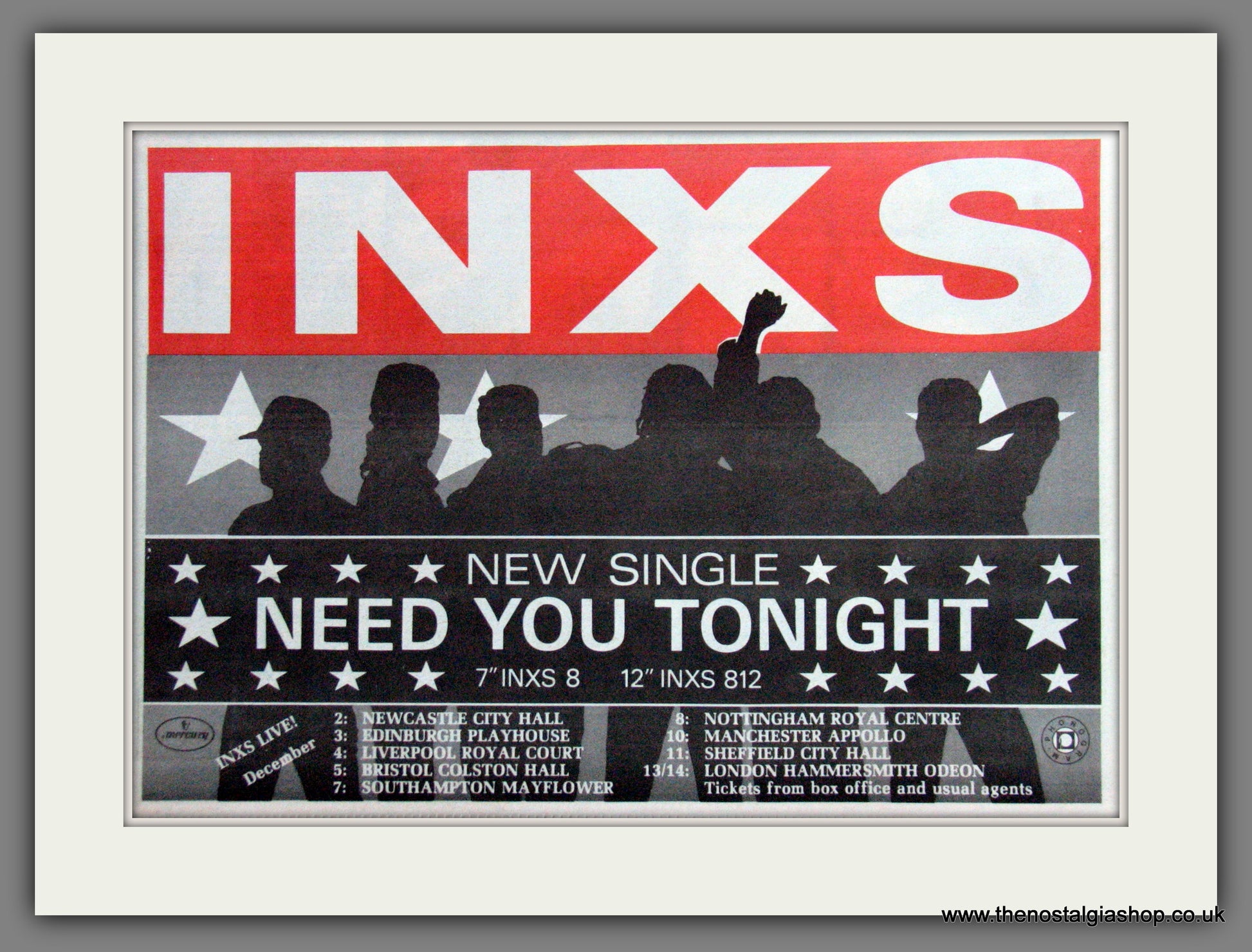 INXS Need You Tonight, Also UK Dates. Classic Original advert 1987. Presented and Supplied in a cream bevel cut mount with backing card and clear bag. Ready to fit in 14 x 11 inch frame. All our adverts, unless clearly stated are Originals from the date shown. They make excellent pieces of wall art and stunning gifts. Many are rare and hard to find and once sold, may not be replaced. Remember you are buying a piece of history. Website watermark is not on original.