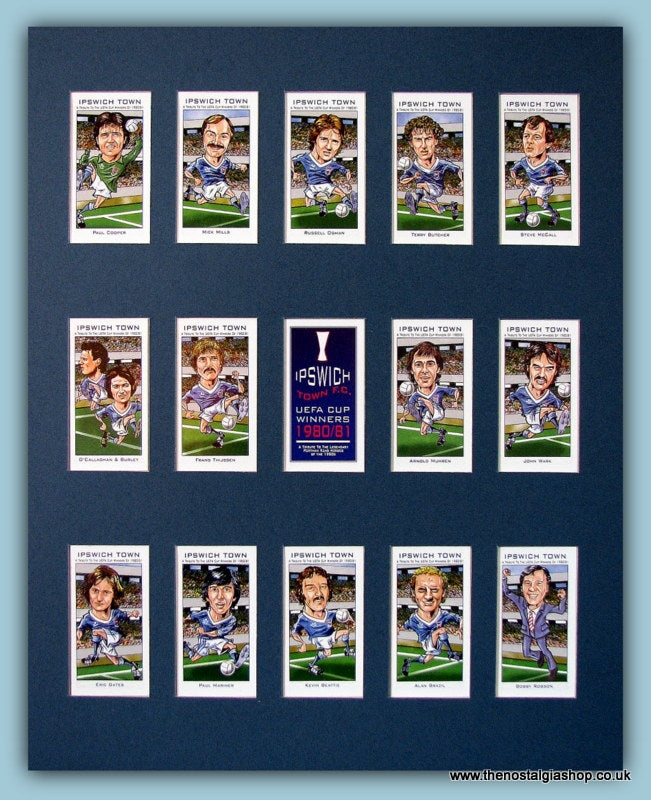 Ipswich Town, A Tribute to the UEFA Cup Winners of 1980/81. Mounted card set of beautifully illustrated caricatures. presented fixed in blue mount with backing board. Players featured are; Paul Cooper, Mick Mills, Russell Osman, Terry Butcher, Steve McCall, O'Callaghan & Burley, Frans Thijssen, Arnold Muhren, John Wark, Eric Gates, Paul Mariner, Kevin Beattie, Alan Brazil and Bobby Robson. Rear of cards not viewable. Made to fit straight into 14 x 11 inch frame.Want It Framing? If so, add this to your basket, then go to the Frames Available Category, Click to add the frame of your choice. We will then assemble and post the set to you. Other teams available.