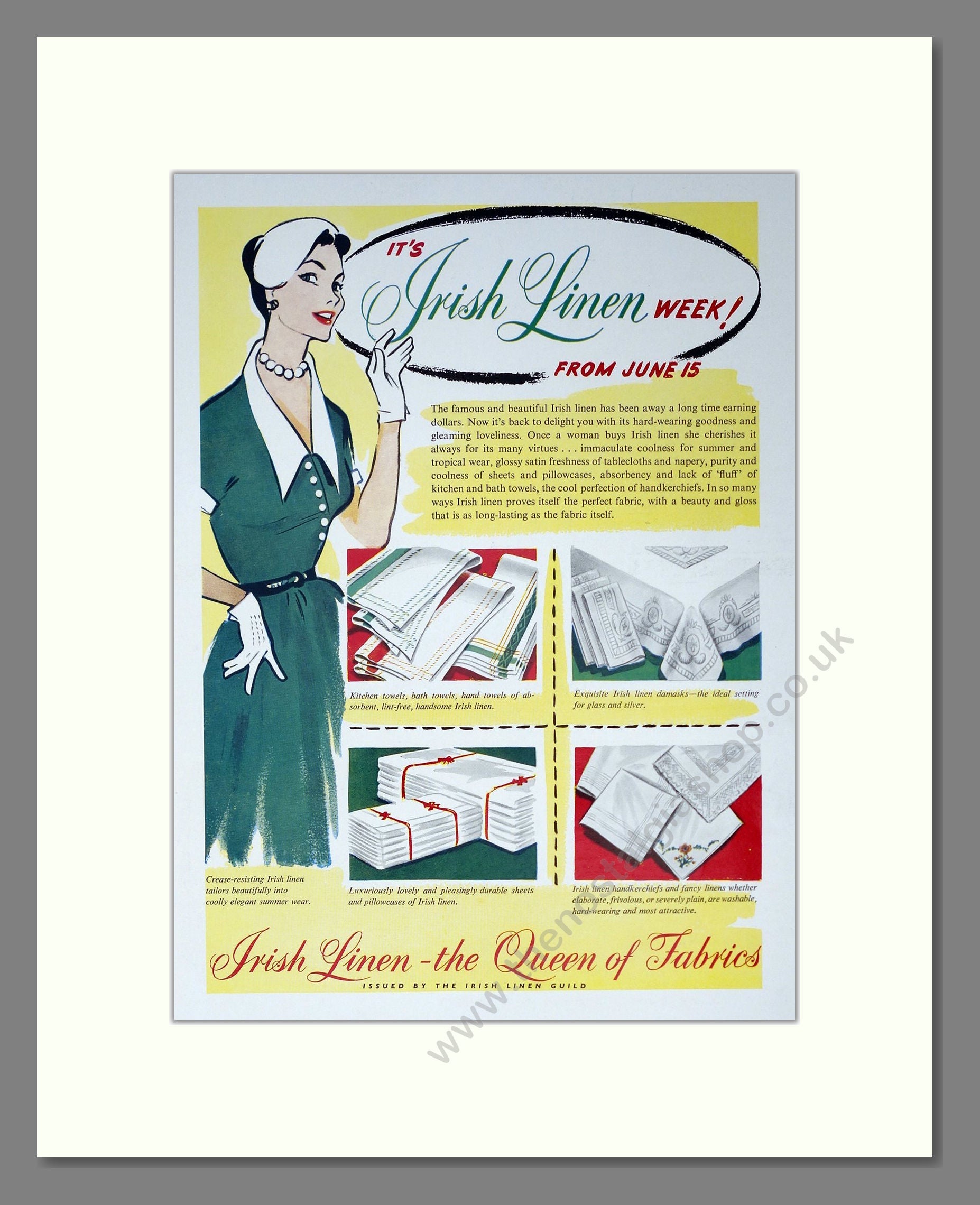 Irish Linen - Table Cloths. Vintage Advert. This is a large classic original advert from 1953. Presented and supplied in a cream bevel cut mount with backing card and clear bag. Ready to fit in a 18 x 14 inches frame. The mounted advert will be posted via courier and well packed - protected with a sheet of hardboard to keep it rigid. Any questions or enquiries, please get in touch, we are here to help! All our adverts, unless clearly stated are originals from the date shown. They make excellent pieces of wall art and stunning gifts. Many are rare and hard to find and once sold, may not be replaced. Remember you are buying a piece of history. Website watermark is not on original.