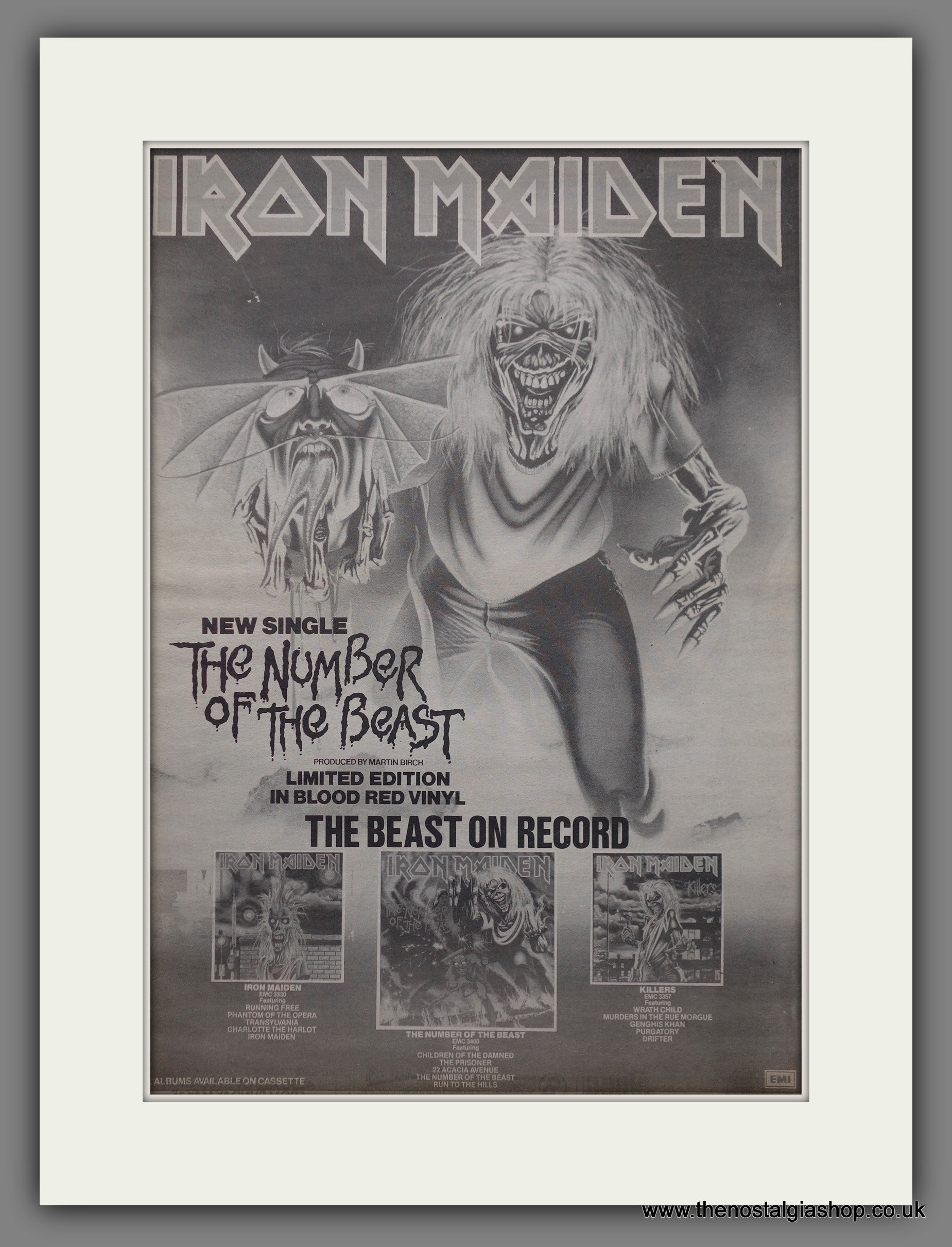 Iron Maiden. The Number of The Beast. WOW. This is a large classic Original Vintage Advert 1982. Presented and Supplied in a cream bevel cut mount with backing card and clear bag. Ready to fit in 20 x 16 inch frame. The mounted advert will be posted via courier and well packed - protected with a sheet of hardboard to keep it rigid. Any questions or inquiries, please get in touch, we are here to help! All our adverts, unless clearly stated are Originals from the date shown. They make excellent pieces of wall art and stunning gifts. Many are rare and hard to find and once sold, may not be replaced. Remember you are buying a piece of history. Website watermark is not on original.