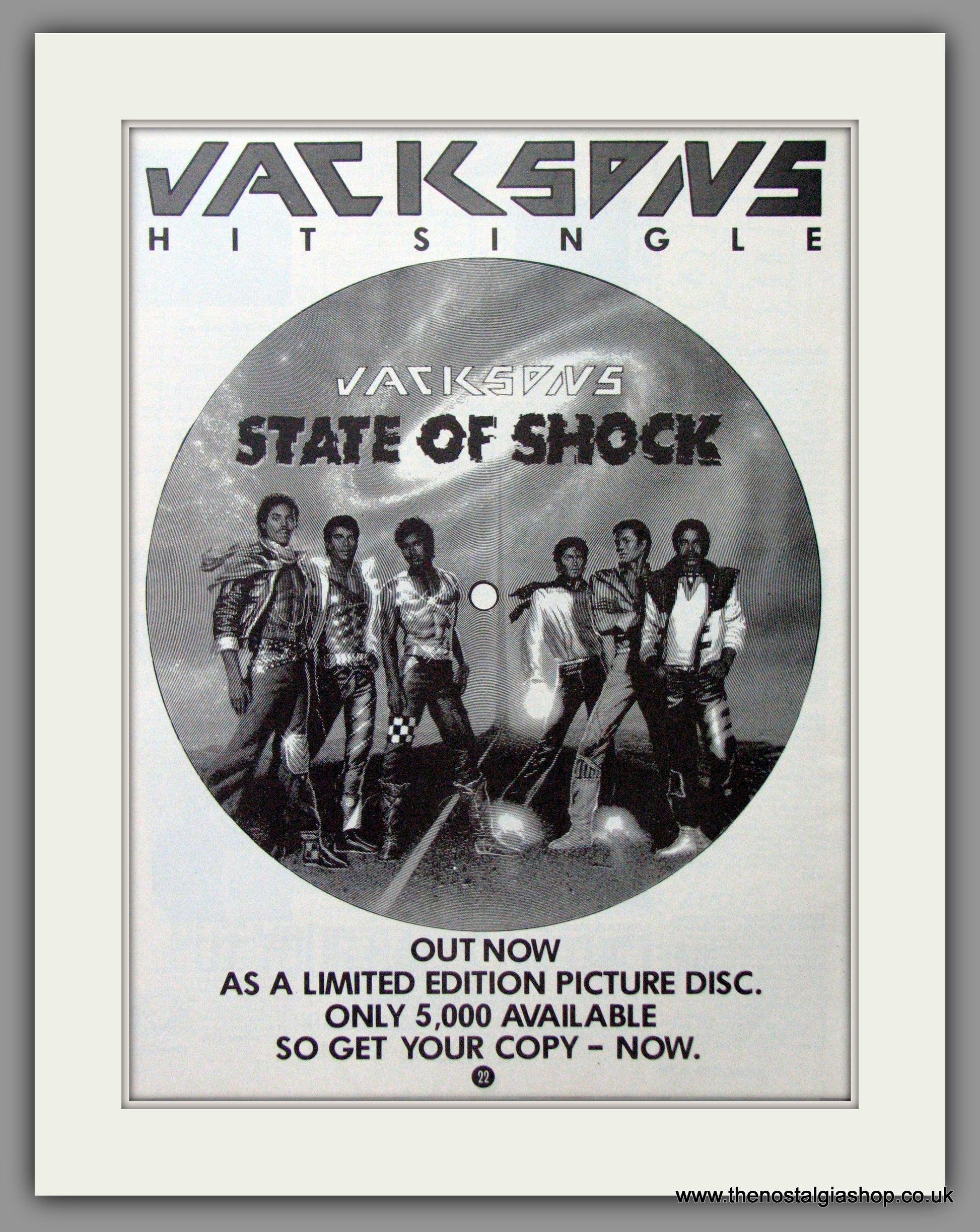 The Jacksons. State of Shock. Michael Jackson. Classic original advert 1984. Presented and Supplied in cream bevel cut mount with backing card and clear bag. Ready to fit in 14 x 11 inch frame. Want it framing? If so, buy this then go to Frames Available Category. Click to buy on the suitable frame and we will do the rest. All our adverts, unless clearly stated are Originals from the date shown. They make excellent pieces of wall art and stunning gifts. Many are rare and hard to find and once sold, may not be replaced. Remember you are buying a piece of history. Website watermark is not on original.