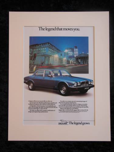 The legend that moves you The Jaguar XJ6 .Original advert from 1984. Presented in cream bevel cut mount with backing board. Made to fit straight into 14x11 inch frame. The perfect gift.- These adverts are all taken from Original publications of the dates stated. They are NOT modern reprints. Many are difficult to get hold of , some are very rare and once sold may not be replaced, Remember, you are buying a piece of historic nostalgia. Lots more adverts available. Please contact us if you don't see the advert you want.