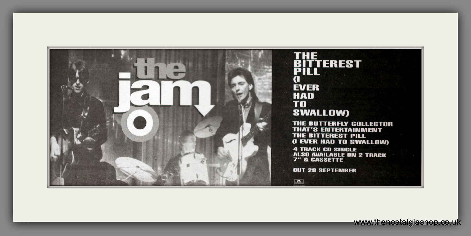 The Jam, The Bitterest Pill. Paul Weller. Classic Original advert 1997. Presented and Supplied in a cream bevel cut mount with backing card and clear bag. Ready to fit in 14.5 x 7 inch frame. Want it framing? If so, buy this then go to Frames Available Category. Click to buy on the suitable frame and we will do the rest. All our adverts, unless clearly stated are Originals from the date shown. They make excellent pieces of wall art and stunning gifts. Many are rare and hard to find and once sold, may not be replaced. Remember you are buying a piece of history. Website watermark is not on original. The Jam, Mods, Ska, 2 Tone.
