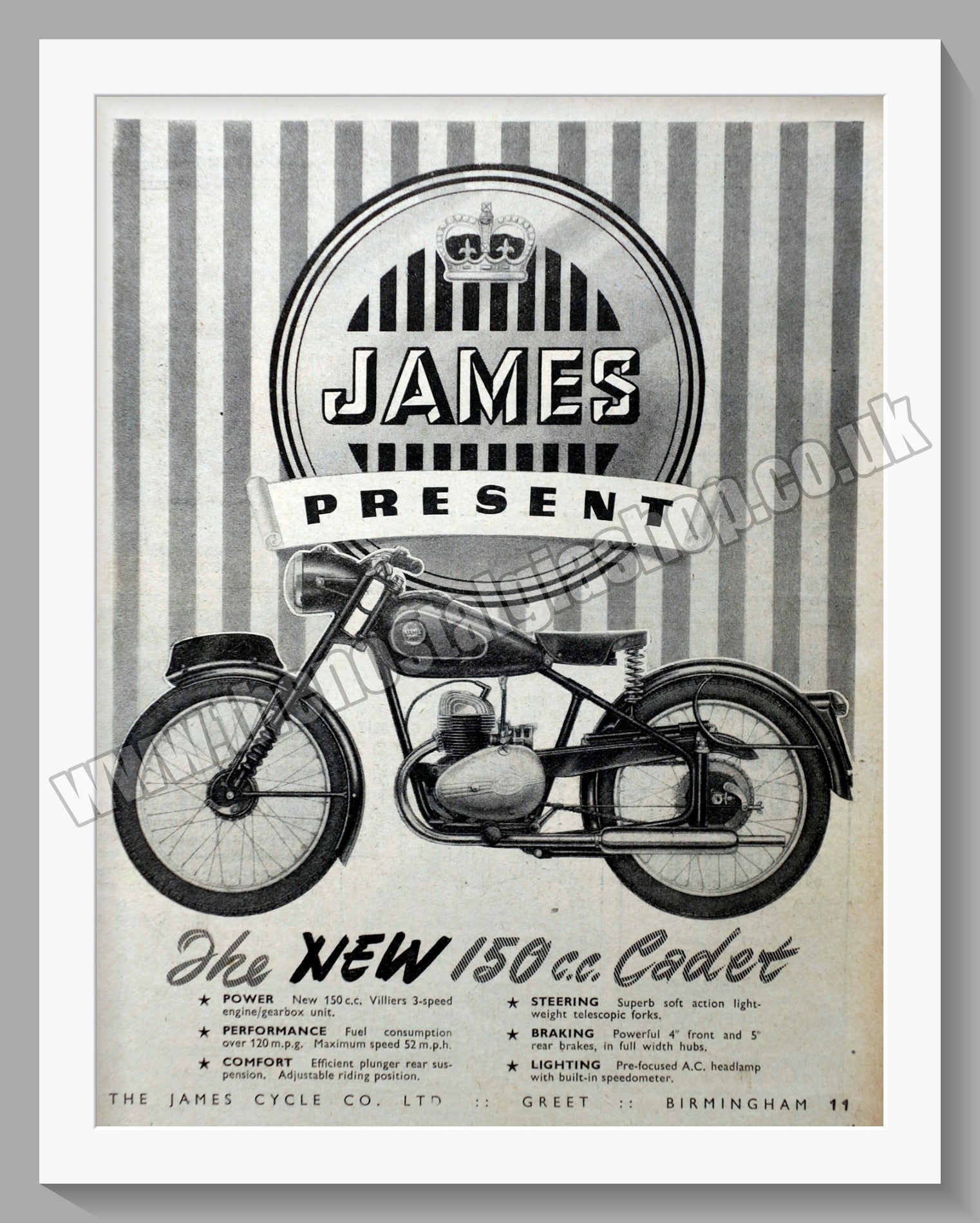 James Cadet 150cc Motor Cycle. Original Vintage Advert 1954. Presented and Supplied in a 14 x 11 Inch, cream bevel cut mount with backing card and Clear Bag. Ready to frame. All our adverts, unless clearly stated are Originals from the date shown. They make excellent pieces of wall art and stunning gifts. Many are rare and hard to find and once sold, may not be replaced. Remember you are buying a piece of history. Website watermark is not on original. Vintage Motorcycles, James Motor Cycles Ltd.
