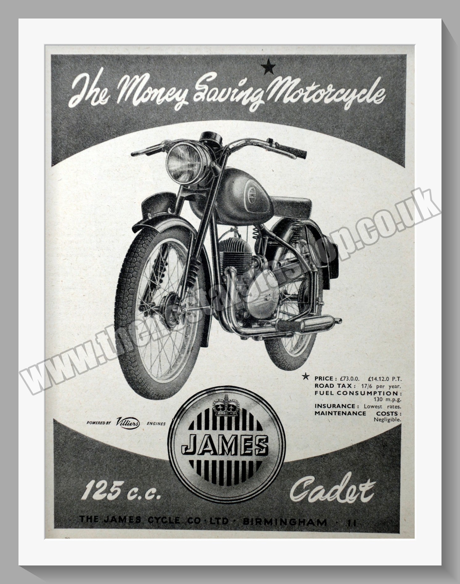 James Cadet 125cc Motor Cycle. Original Vintage Advert 1954. Presented and Supplied in a 14 x 11 Inch, cream bevel cut mount with backing card and Clear Bag. Ready to frame. All our adverts, unless clearly stated are Originals from the date shown. They make excellent pieces of wall art and stunning gifts. Many are rare and hard to find and once sold, may not be replaced. Remember you are buying a piece of history. Website watermark is not on original. Vintage Motorcycles, James Motor Cycles Ltd.