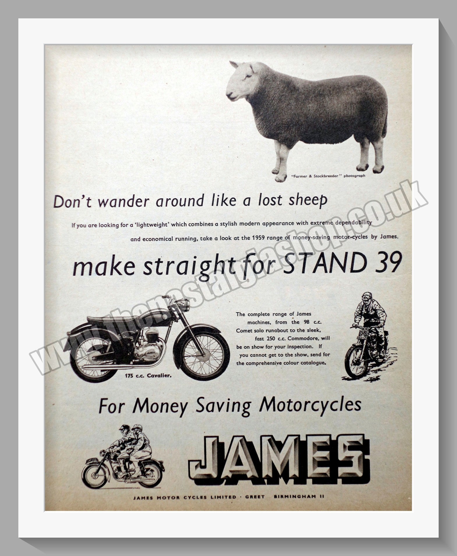 James Motor Cycles. Original Vintage Advert 1958. Presented and Supplied in a 14 x 11 Inch, cream bevel cut mount with backing card and Clear Bag. Ready to frame. All our adverts, unless clearly stated are Originals from the date shown. They make excellent pieces of wall art and stunning gifts. Many are rare and hard to find and once sold, may not be replaced. Remember you are buying a piece of history. Website watermark is not on original. Vintage Motorcycles, James Motor Cycles Ltd.