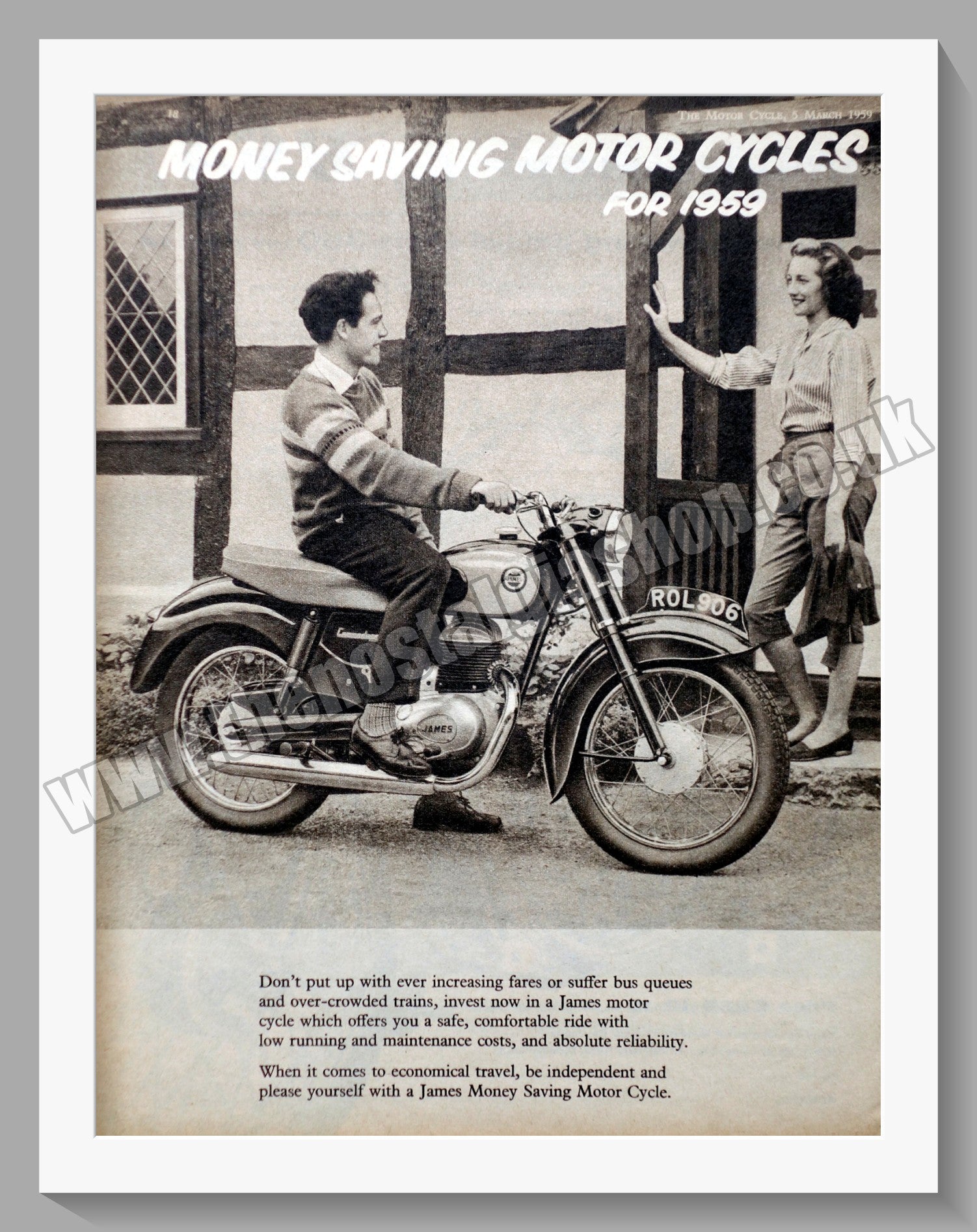 James Motor Cycles. Original Vintage Advert 1959. Presented and Supplied in a 14 x 11 Inch, cream bevel cut mount with backing card and Clear Bag. Ready to frame. All our adverts, unless clearly stated are Originals from the date shown. They make excellent pieces of wall art and stunning gifts. Many are rare and hard to find and once sold, may not be replaced. Remember you are buying a piece of history. Website watermark is not on original. Vintage Motorcycles, James Motor Cycles Ltd.