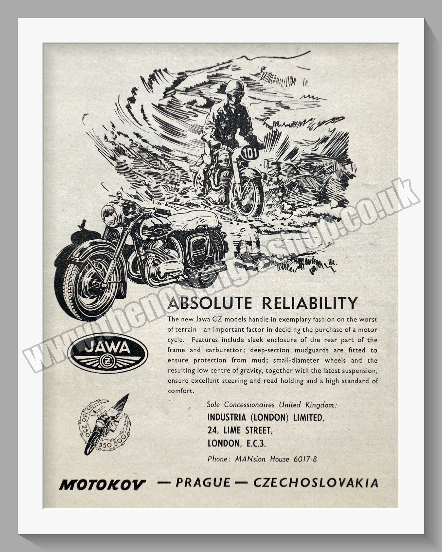 Jawa CZ Motorcycles. Motokov Ltd. Classic original advert, 1955. Presented and Supplied in a 14 x 11 Inch, cream bevel cut mount with backing card. Ready to frame. All our adverts, unless clearly stated are Originals from the date shown They make excellent pieces of wall art and stunning gifts. Many are rare and hard to find and once sold, may not be replaced. Remember you are buying a piece of history. Website watermark is not on original.