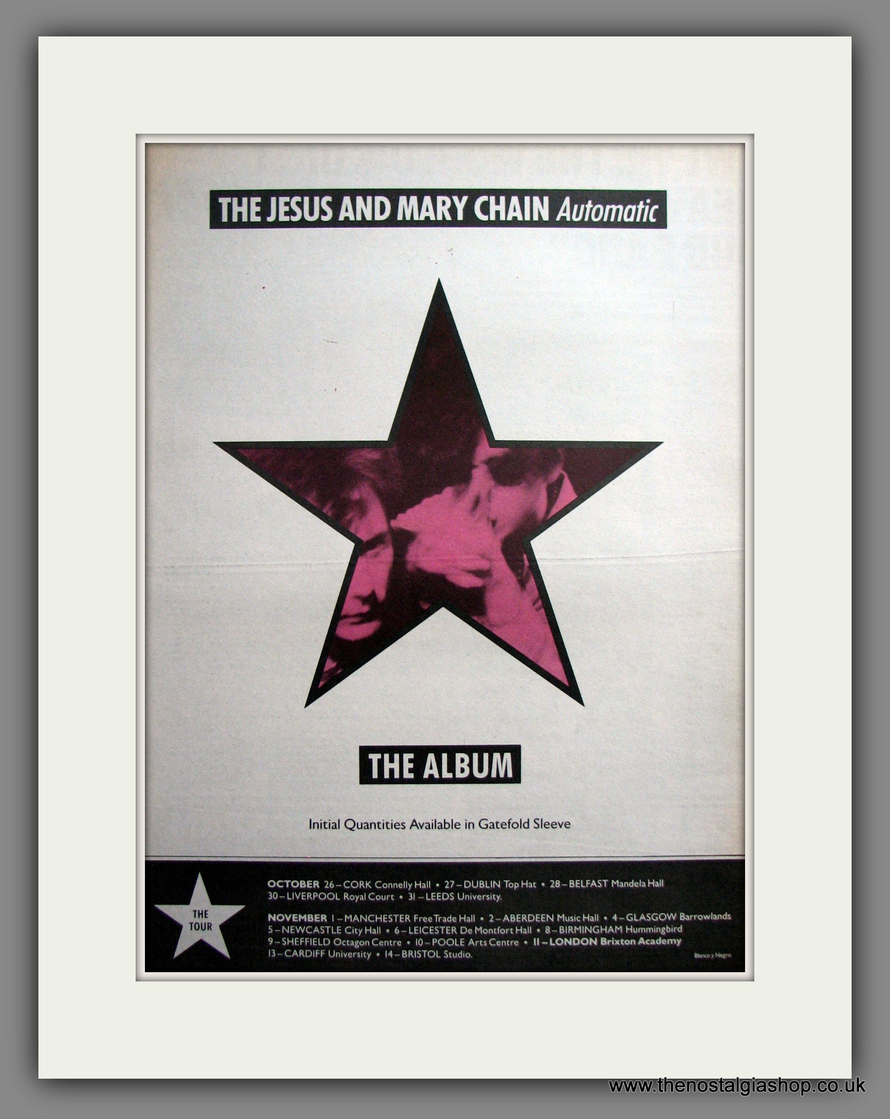 Jesus And Mary Chain, Automatic. Original Advert 1989 (ref AD12432). Presented and supplied in a cream bevel cut mount with backing card and clear bag. Ready to fit in a 20x16 inch frame. The mounted advert will be posted via courier and well packed - protected with a sheet of hardboard to keep it rigid. Any questions or enquiries, please get in touch, we are here to help! All our adverts, unless clearly stated are originals from the date shown. They make excellent pieces of wall art and stunning gifts. Many are rare and hard to find and once sold, may not be replaced. Remember you are buying a piece of history. Website watermark is not on original.