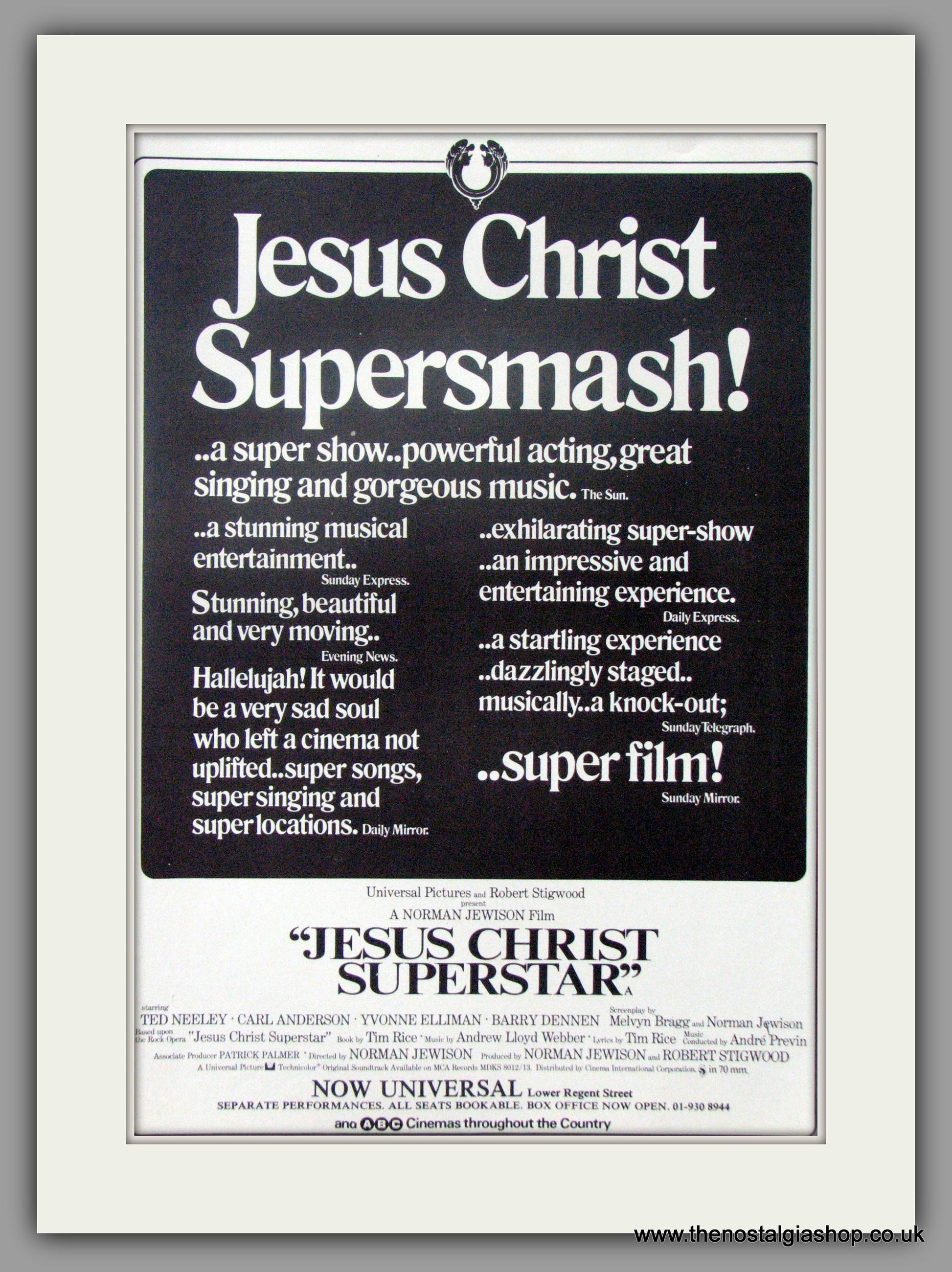 Jesus Christ Superstar. Classic Original advert 1973. Presented in cream bevel cut mount with backing card and clear bag. Ready to fit in 14 x 11 inch frame. Want it framing? If so, buy this then go to Frames Available Category. Click to buy on the suitable frame and we will do the rest. All our adverts, unless clearly stated are Originals from the date shown. They make excellent pieces of wall art and stunning gifts. Many are rare and hard to find and once sold, may not be replaced. Remember you are buying a piece of history. Website watermark is not on original. Australian Rock.