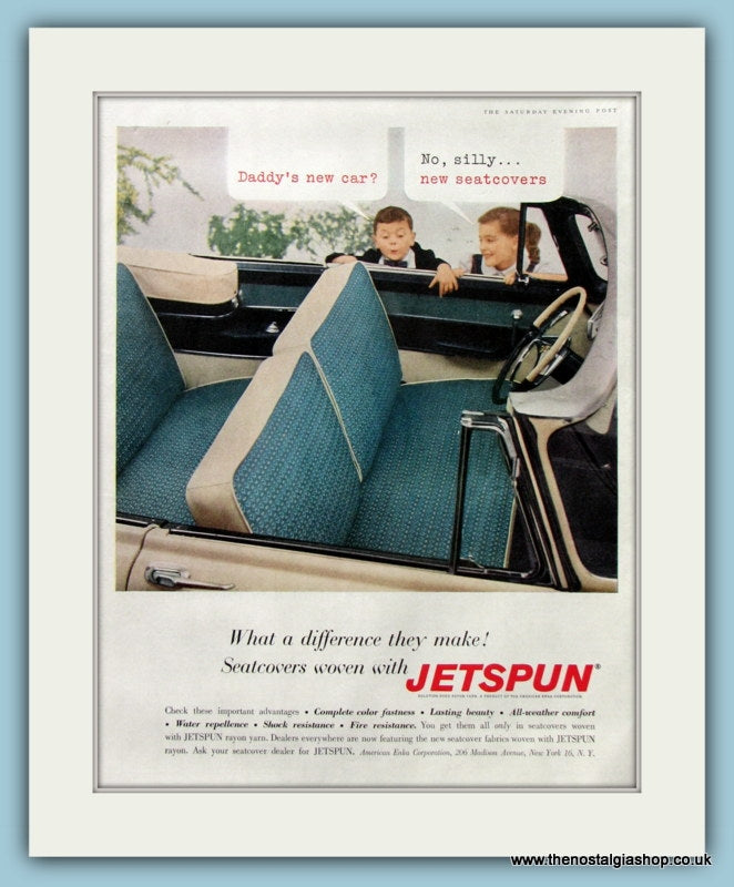 Jetspun Car Seat Covers. What a difference they make! Seat covers woven with Jetspun. Classic original advert 1956. Presented in a 20 x 16 Inch cream mount with backing board and clear bag. Ready to Frame. All our adverts, unless clearly stated are Originals from the date shown. They make excellent pieces of wall art and stunning gifts. Many are rare and hard to find and once sold, may not be replaced. Remember you are buying a piece of history. Website watermarks are not on original. Adverts will be well packed with hardboard to keep rigid in the post.