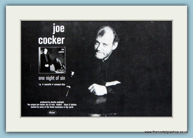 Joe Cocker. One Night Of Sin. Classic original advert 1989. Presented in cream bevel cut mount with backing card. Ready to fit in 12 x 10 inch frame. Want it framing? buy this then go to Frames Available Category. Click to buy on the suitable frame and we will do the rest. All our adverts, unless clearly stated are Originals from the date shown They make excellent pieces of wall art and stunning gifts. Many are rare and hard to find and once sold, may not be replaced. Remember you are buying a piece of history. Website watermark is not on original.