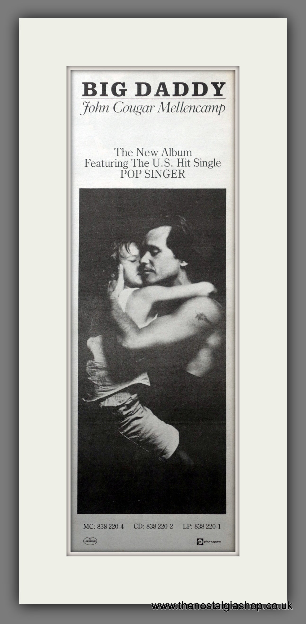 John Cougar Mellencamp Big Daddy. This is a large Original Vintage Advert 1989. Presented and Supplied in a cream, bevel cut mount with backing card and clear bag. Ready to fit in 20 x 10 inch frame. The mounted advert will be posted via courier and well packed - protected with a sheet of hardboard to keep it rigid. Any questions or inquiries, please get in touch, we are here to help! All our adverts, unless clearly stated are Originals from the date shown. They make excellent pieces of wall art and stunning gifts. Many are rare and hard to find and once sold, may not be replaced. Remember you are buying a piece of history. Website watermark is not on original.